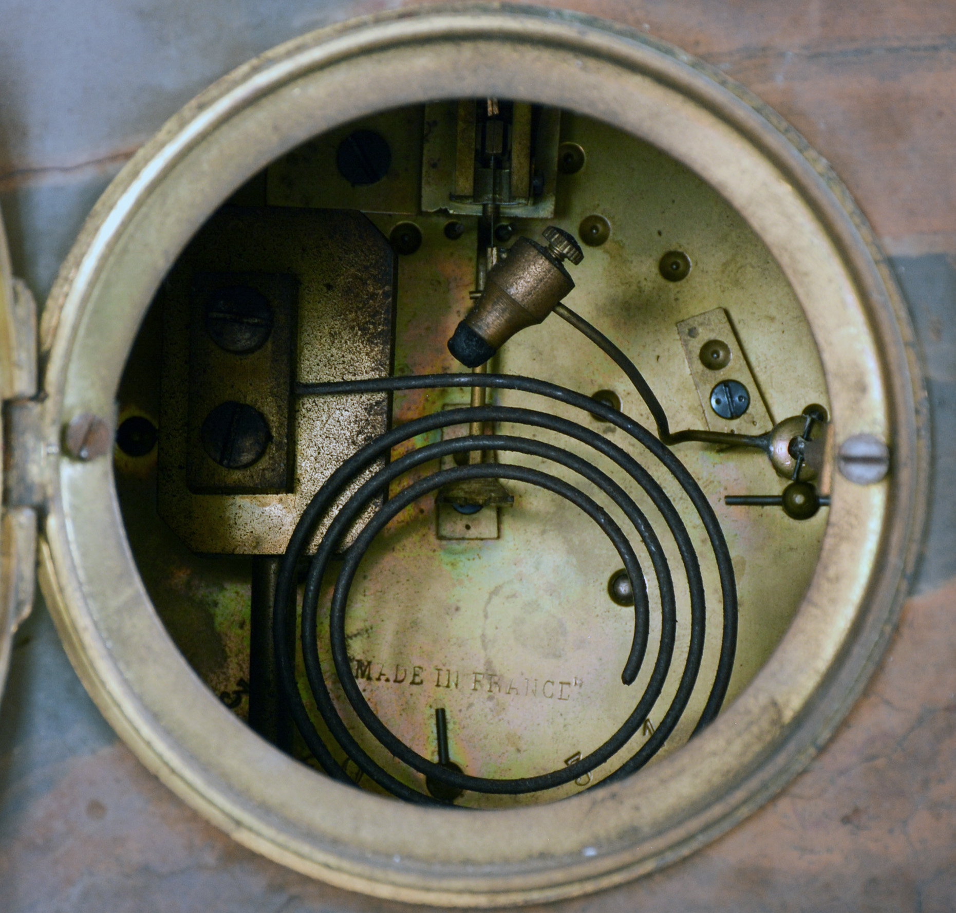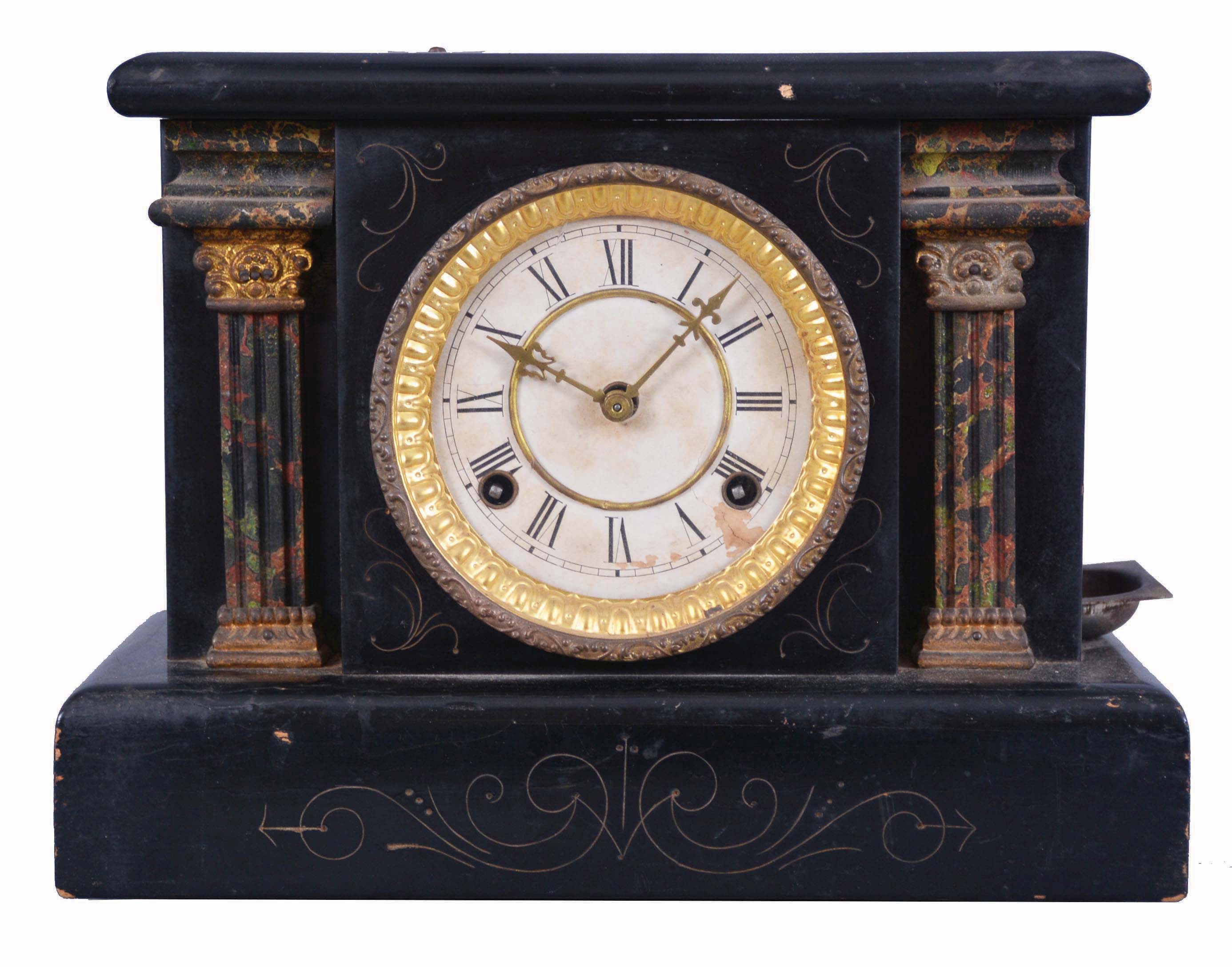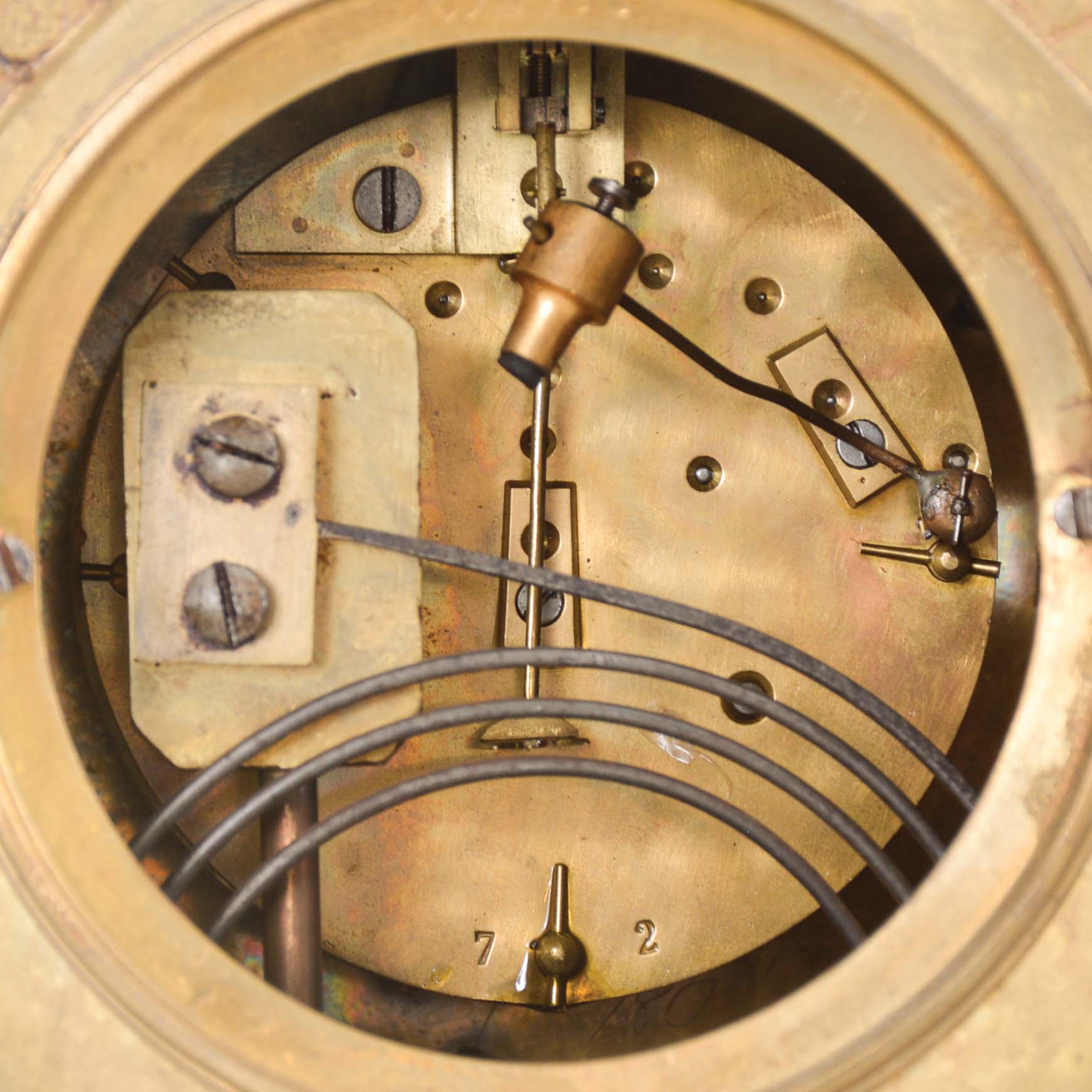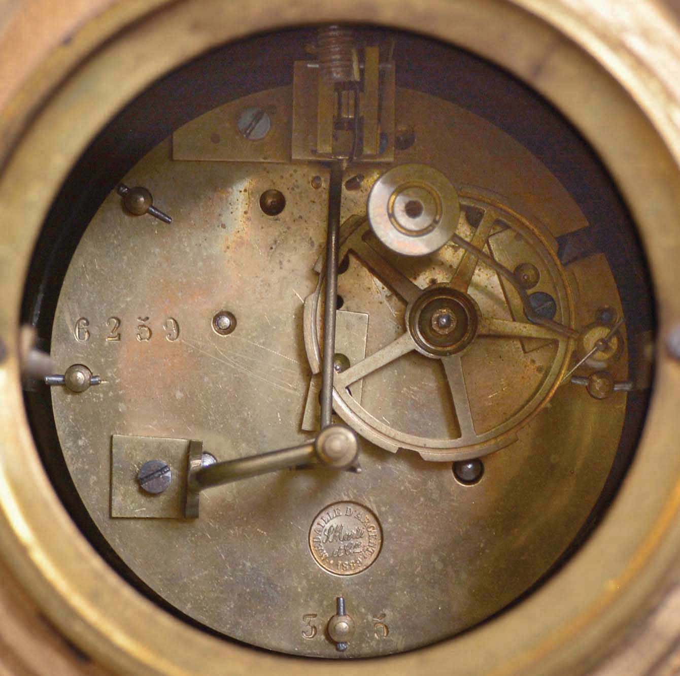 Condition Report: the case has very few discernible chips along the edges. Black slate has started to show some cloudy patches. Red pallet jewels in escapement of signed Marti movement. Thick beveled glass is fine. Hands are original. The clock ticks and strikes, but was not tested long term.
