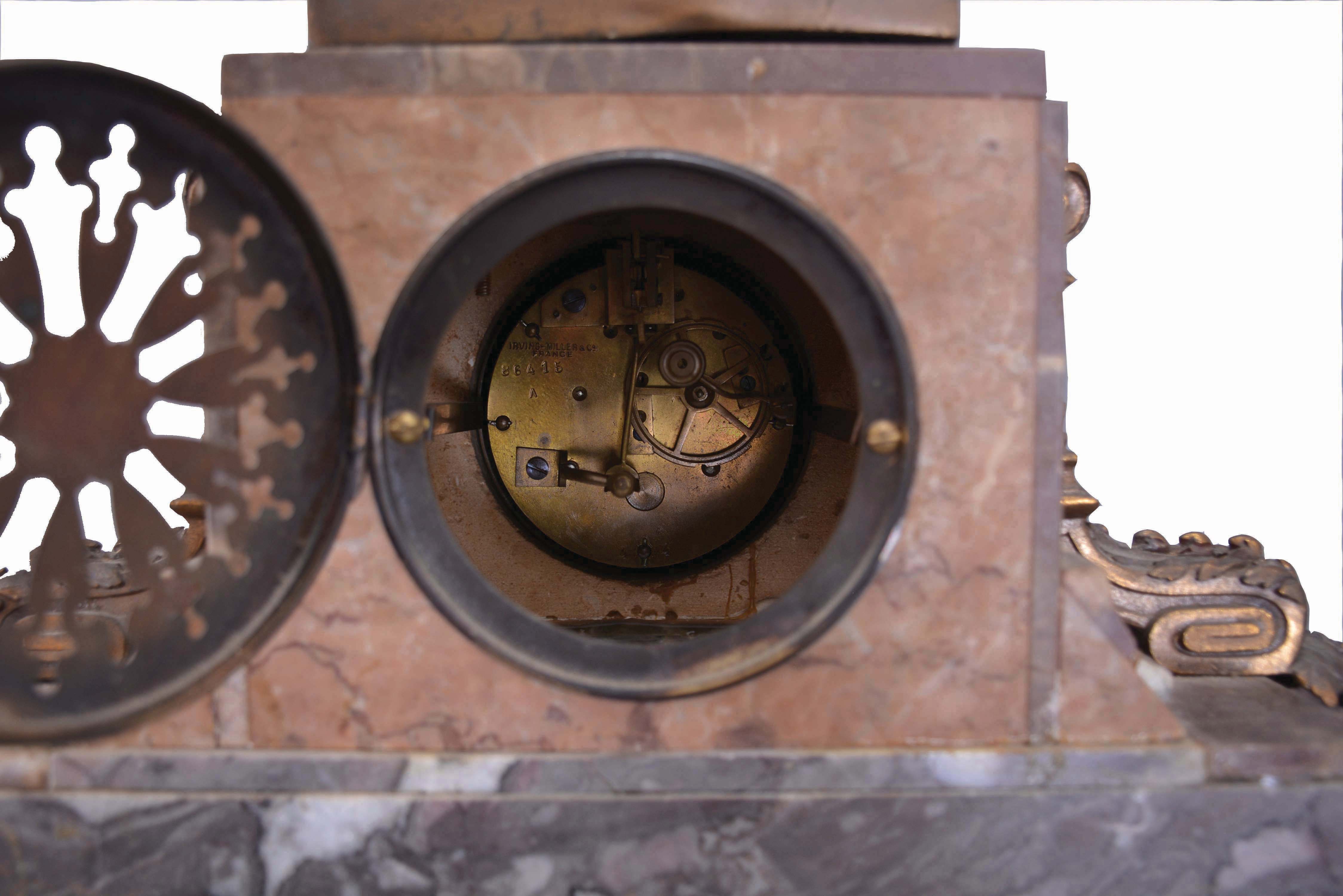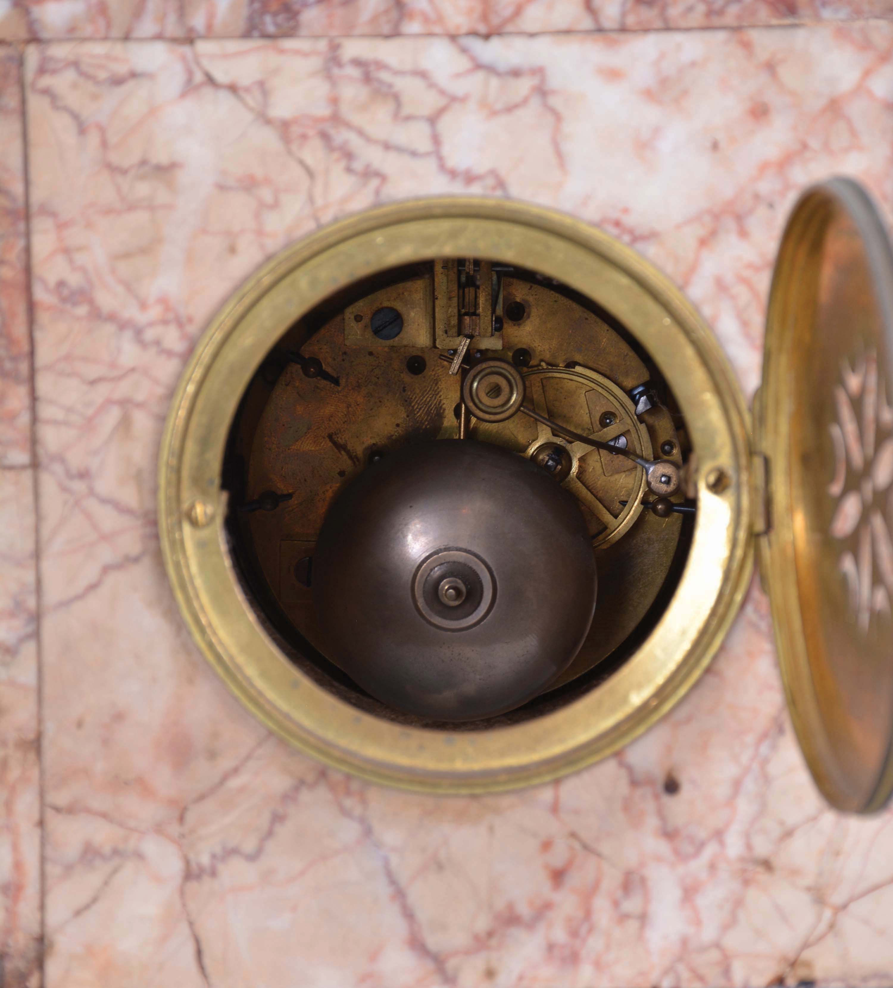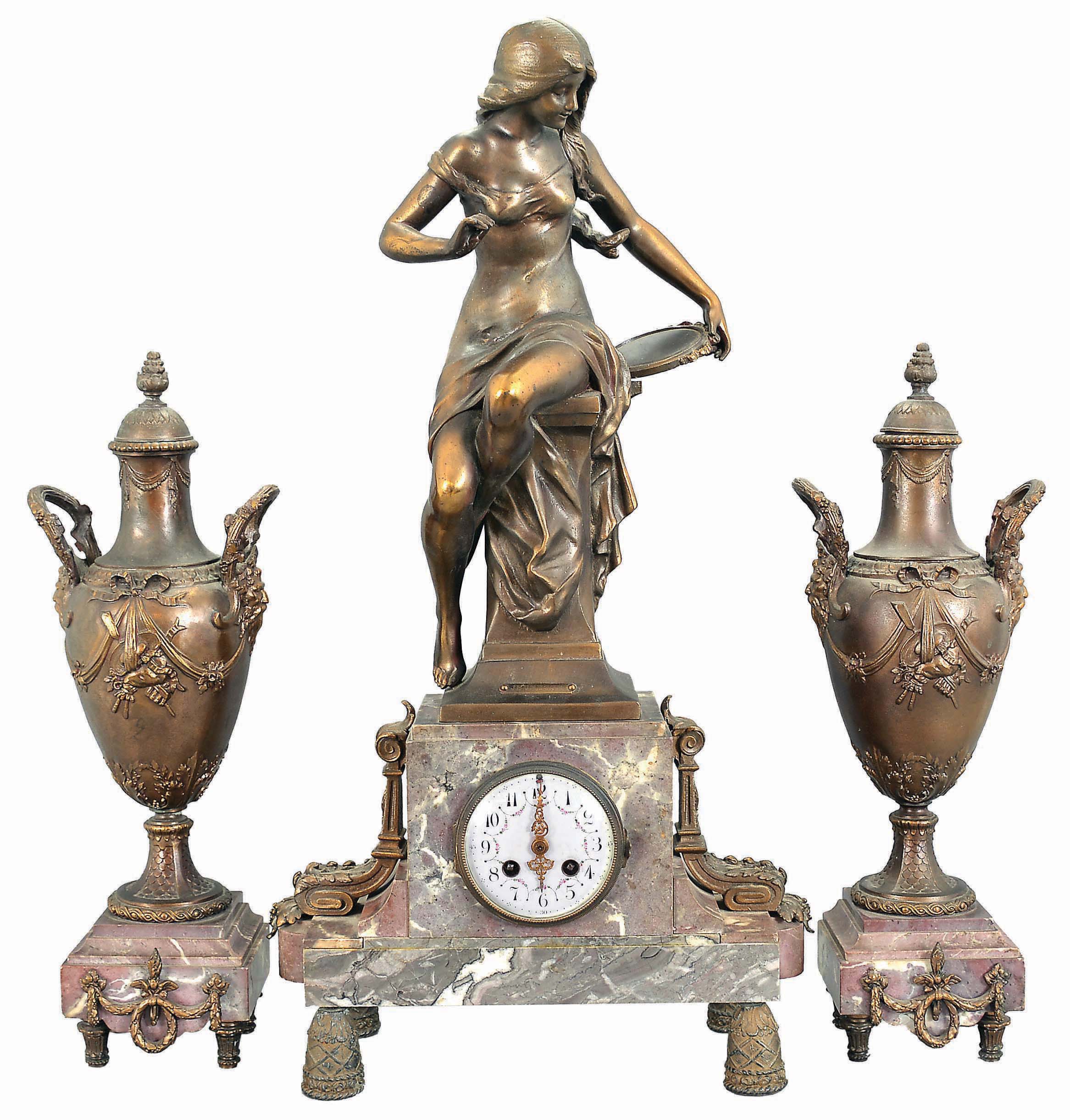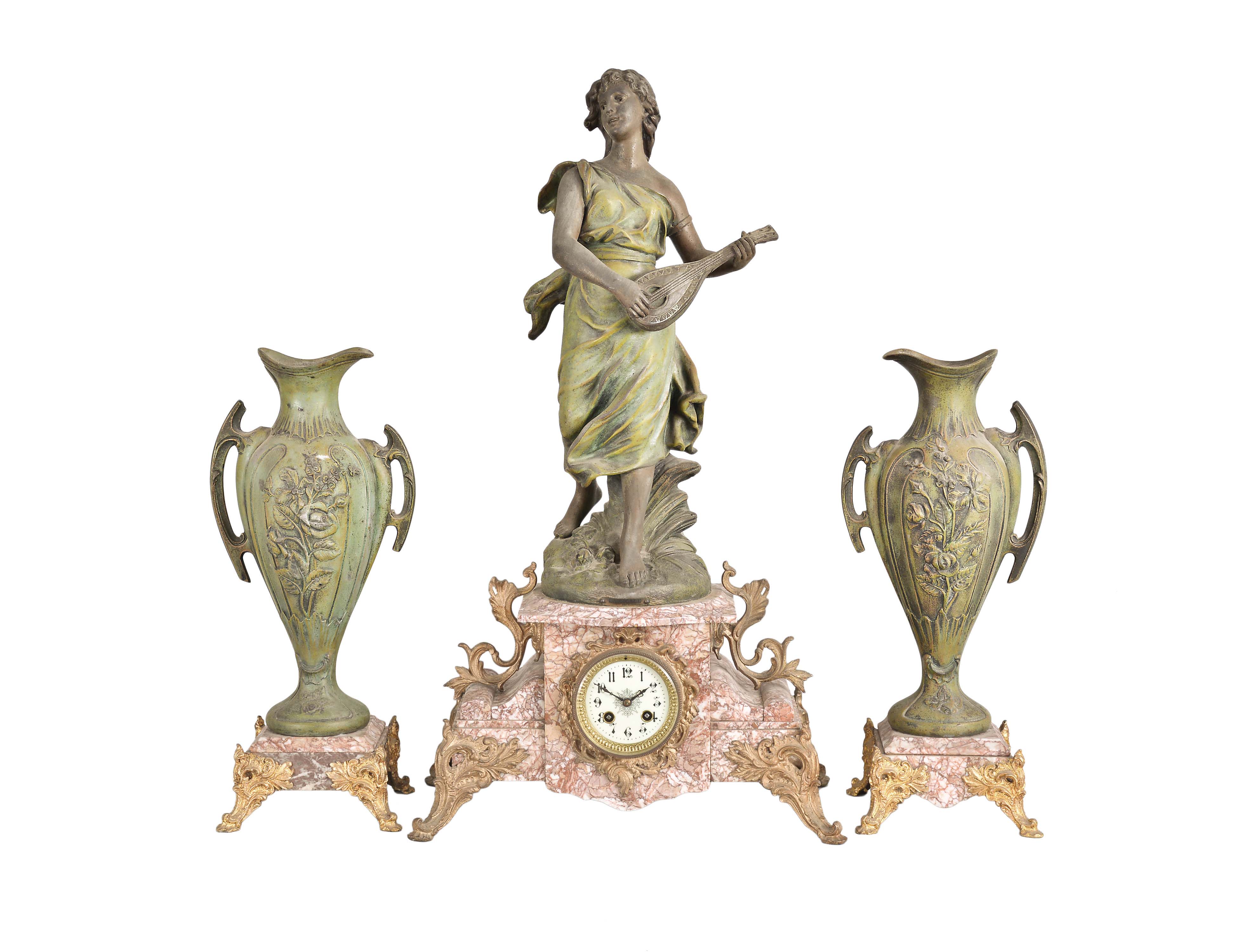 France, Variegated Pink Marble Figural Clock Garniture, the clock with off-white arabic numeral dial within a brass bezel and beveled glass set within the marble case with scroll work dial surround, on raised feet and and plinth for the statue titled "La Cigale" a sculpture first presented by Sylvain Kinsburger, the patinated figure of a young maiden no doubt playing the 'Song of the Cicada' on her lute, eight-day spring powered, round French movement with count-wheel hour and half hour strike on a bell, together with two matching and imposing ewers with floral facades and carrying handles on raised pink marble bases with gilt feet.