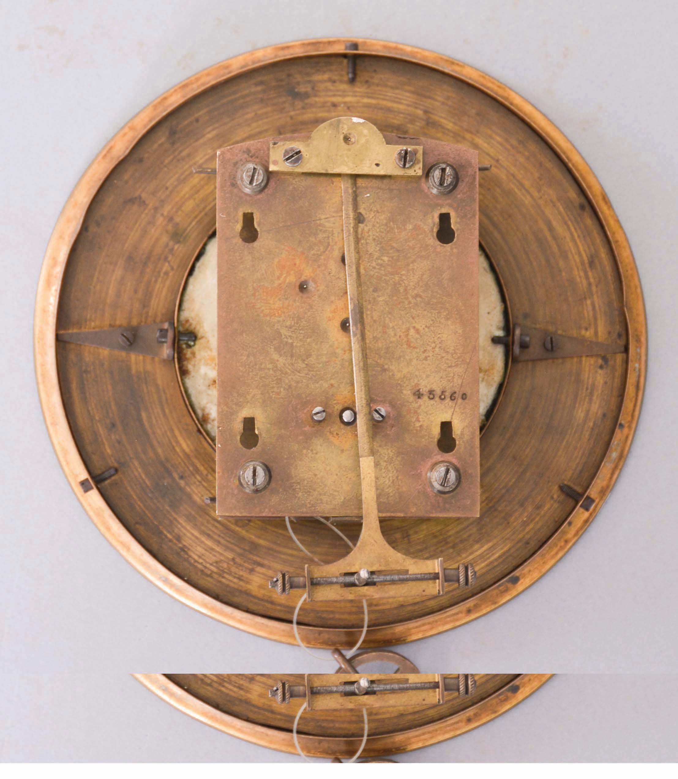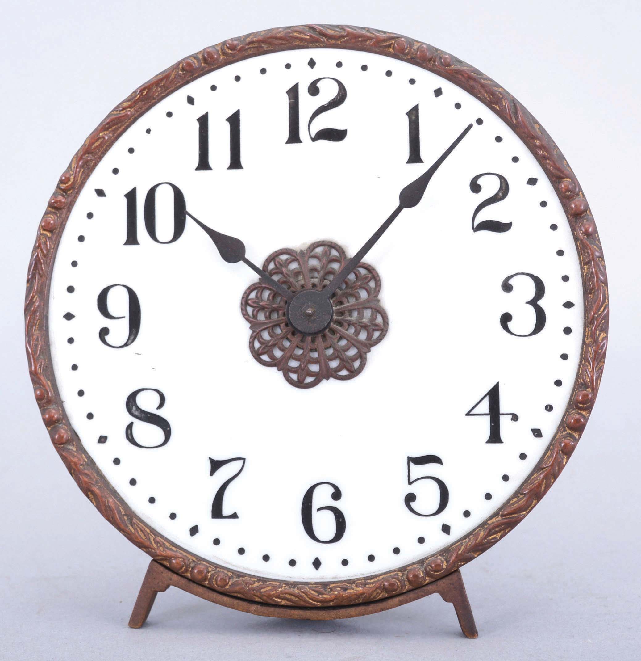 Condition Report: This example is in as found condition. The base is tarnished with some corrosion at the base screws Original porcelain dial is perfect. Original hands. Dome is missing. Balance spring has some slight surface rust at the mounting pin. For reference please see the thorough examination of these German Eureka's detailed on pages of 38- 44 of F.G. Alan Shenton's "The Eureka Clock".