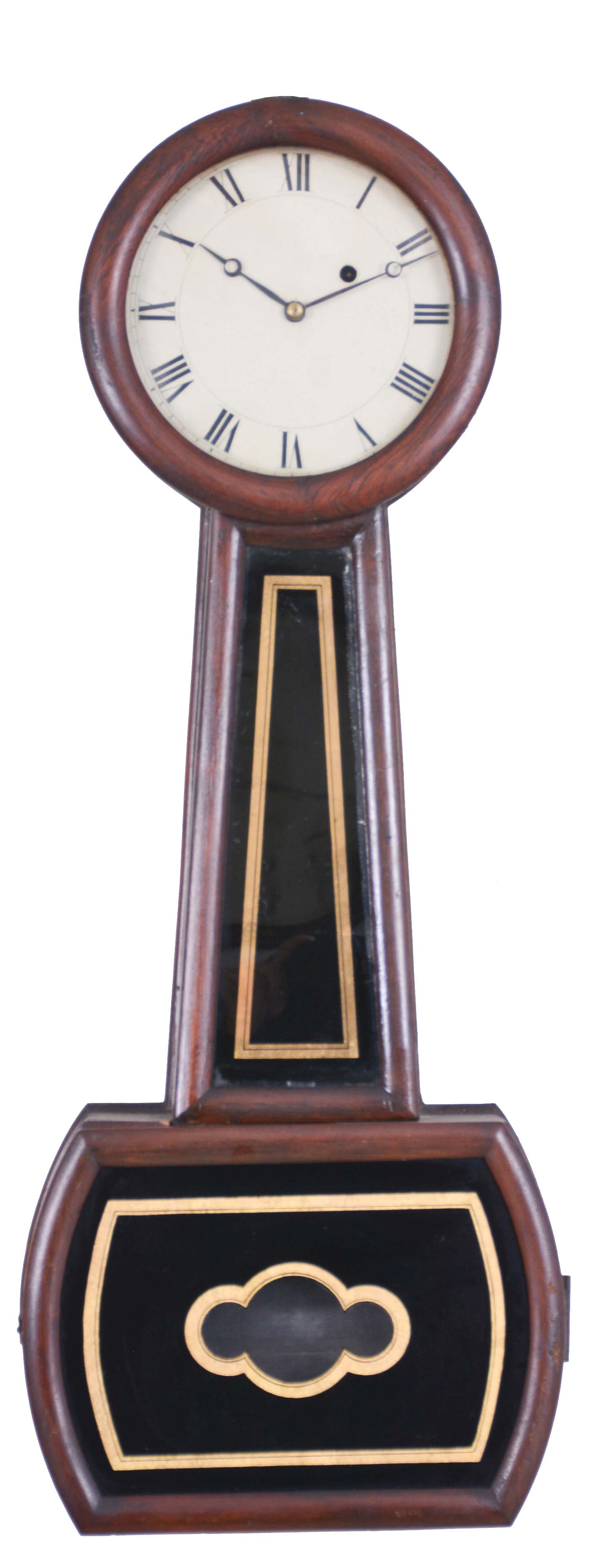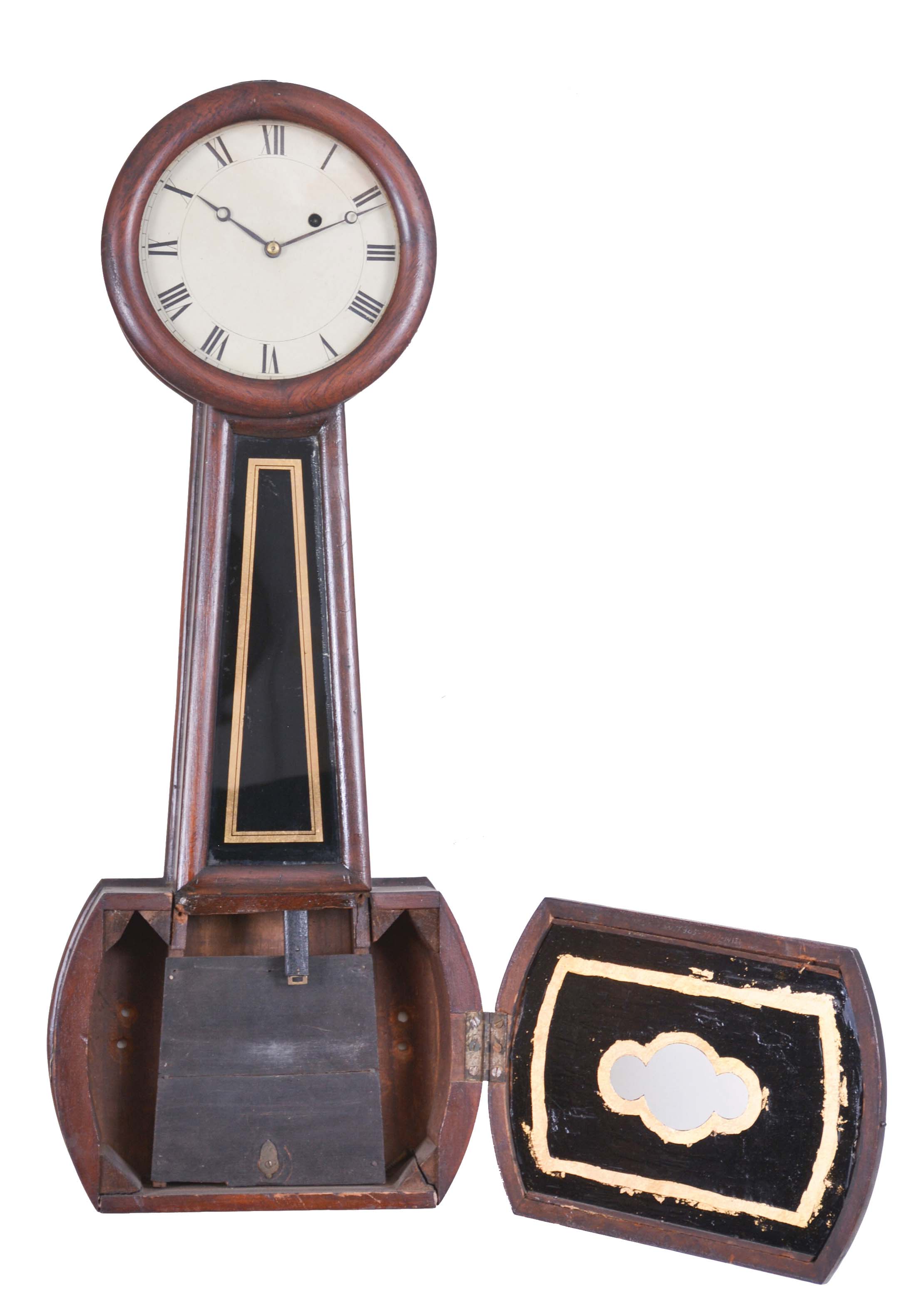 North Attleboro, Massachusetts "Banjo No. 5" Wall Clock with mahogany frames and tulip poplar carcass, roman numeral painted iron dial under a turned wooden bezel, half-round frames enclose black and gold glasses, eight day time only movement with recoil escapement, wooden pendulum rod, brass faced-bob and cast iron weight.