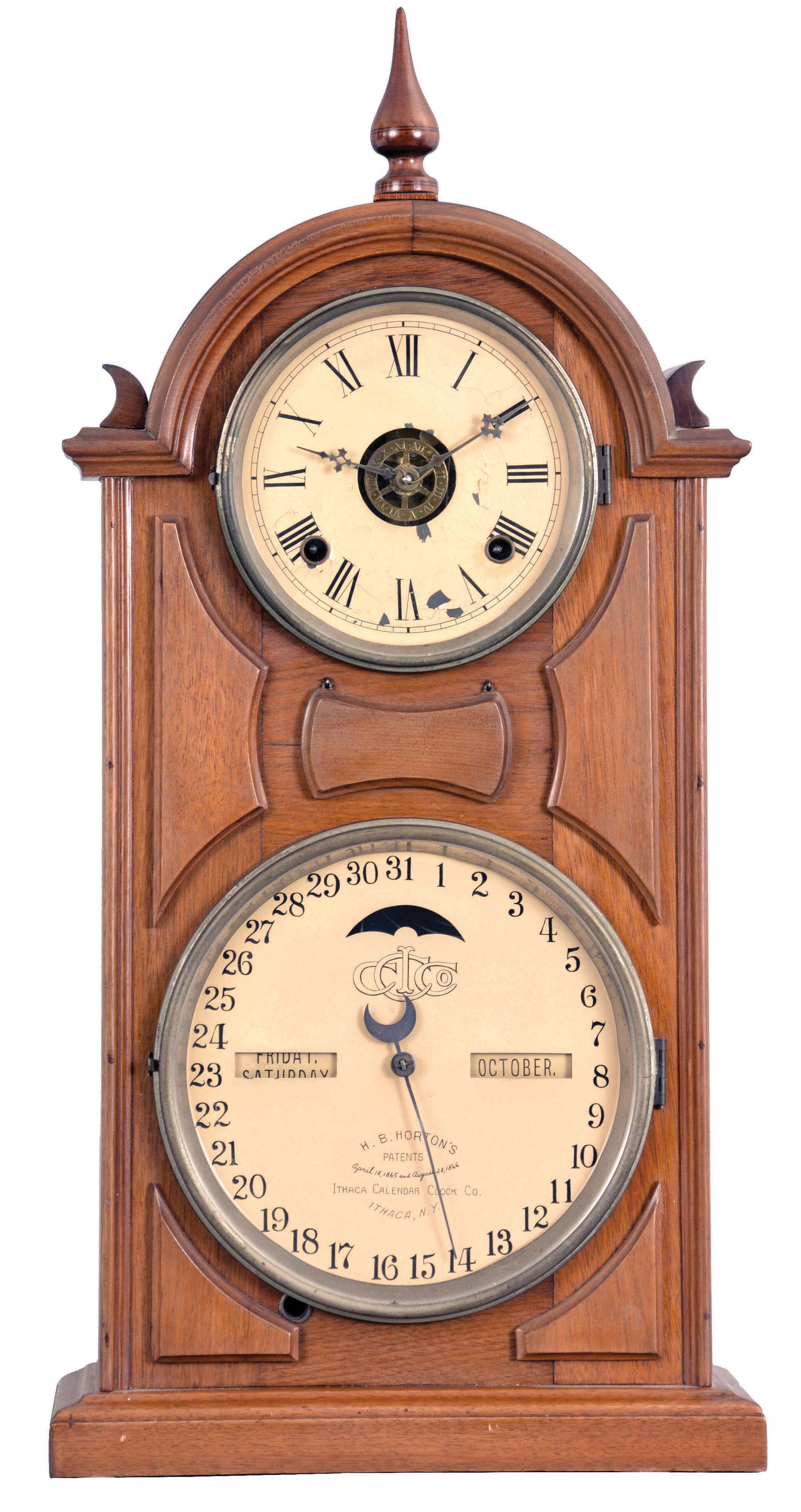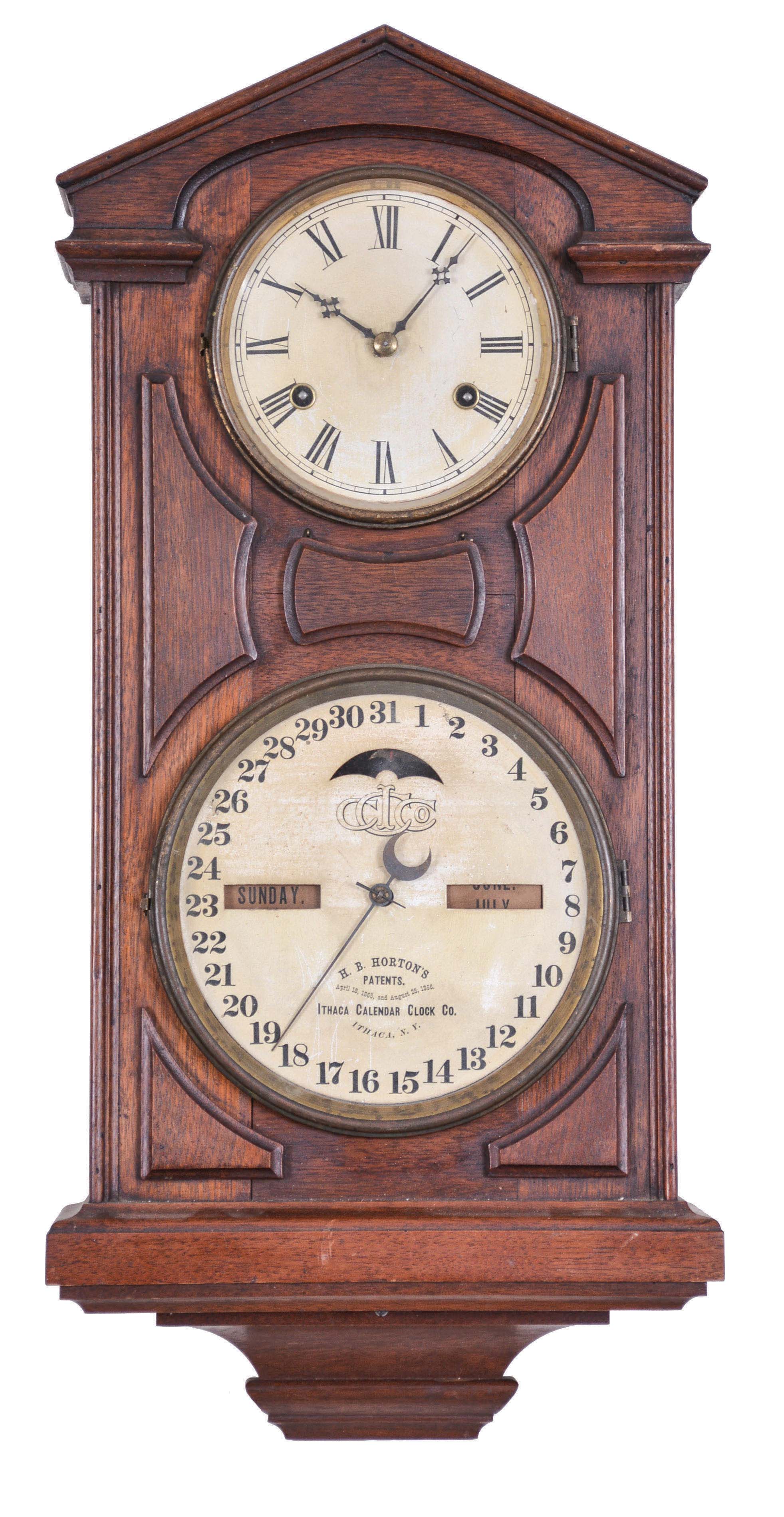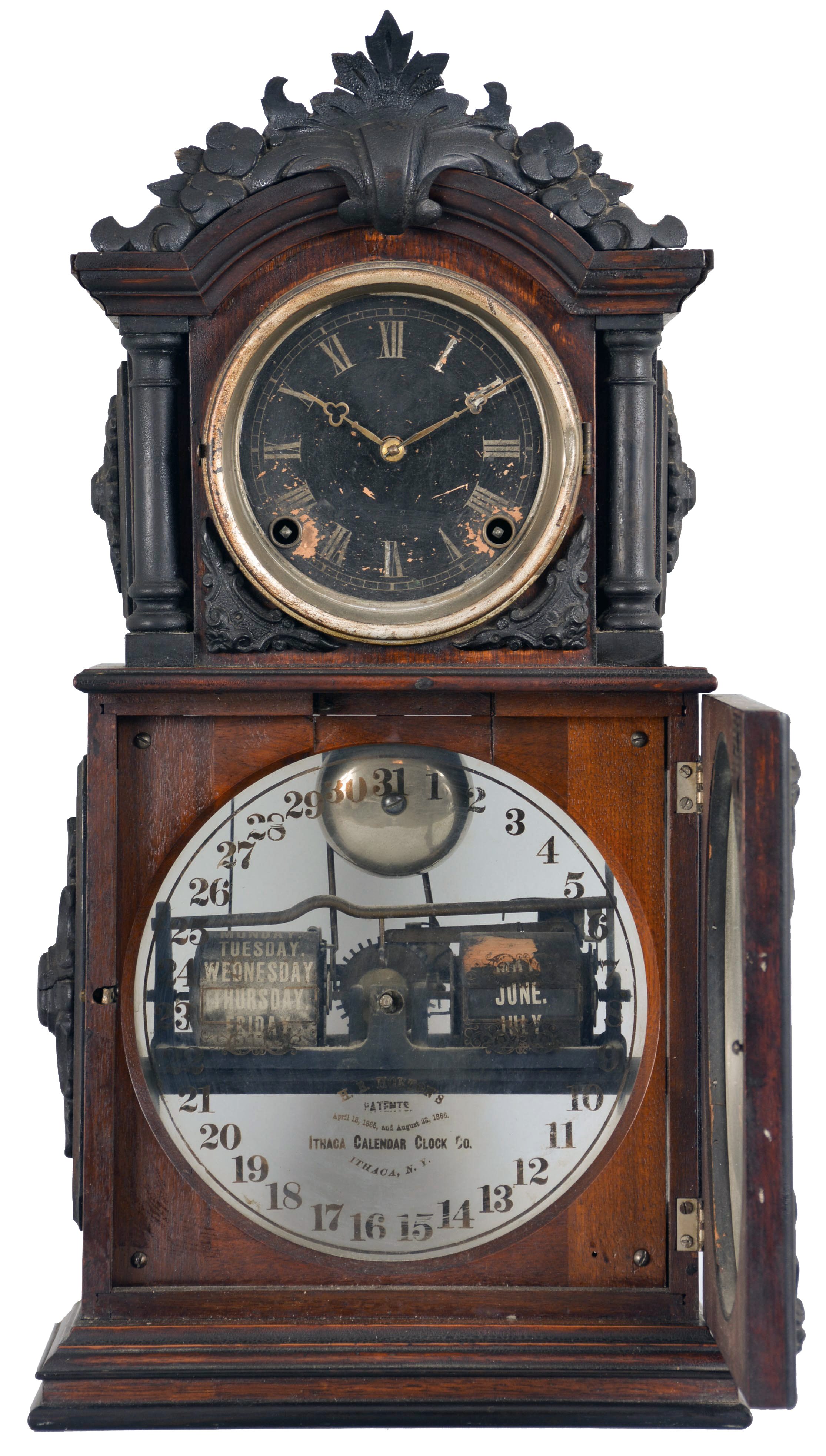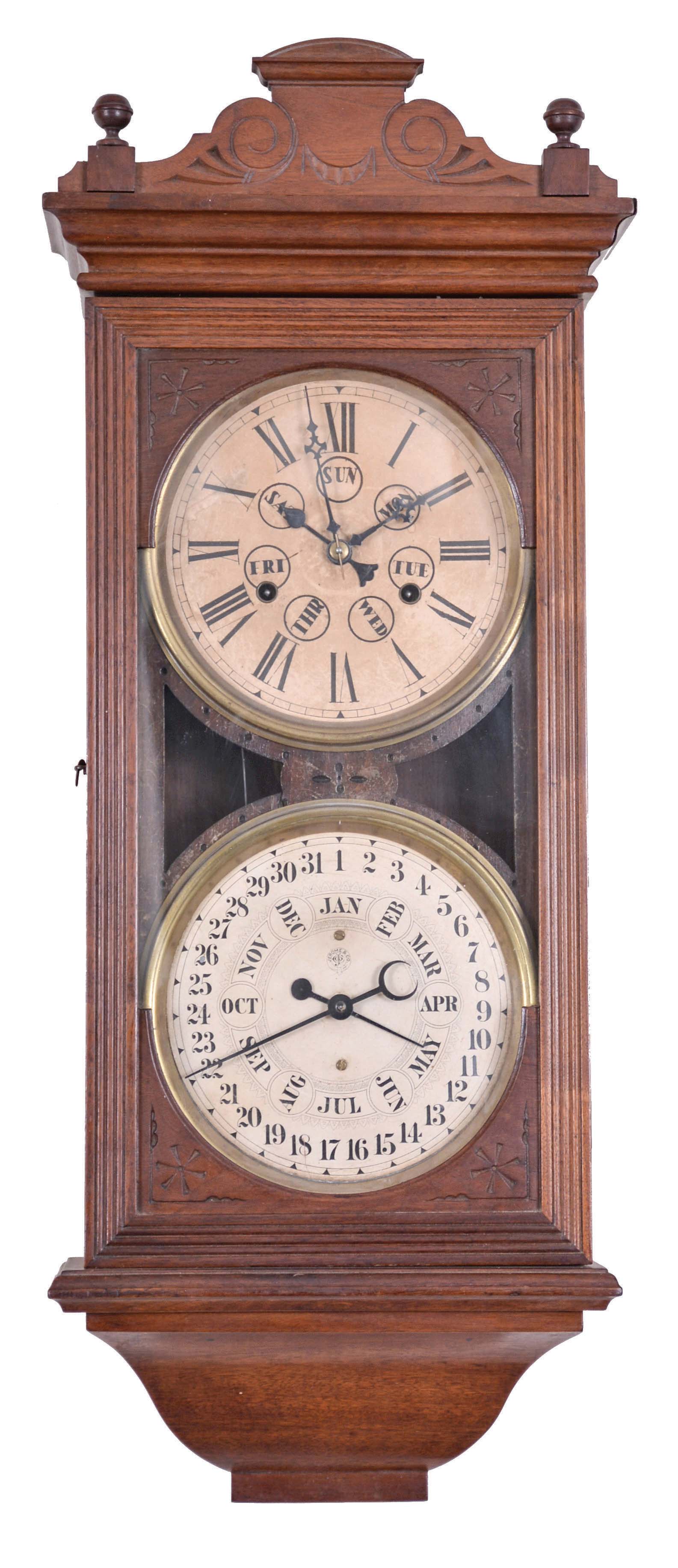Jerome & Co. (New Haven Clock Co.), New Haven, Conn., "Register", 8 day, time and strike, spring brass movement double dial calendar clock.