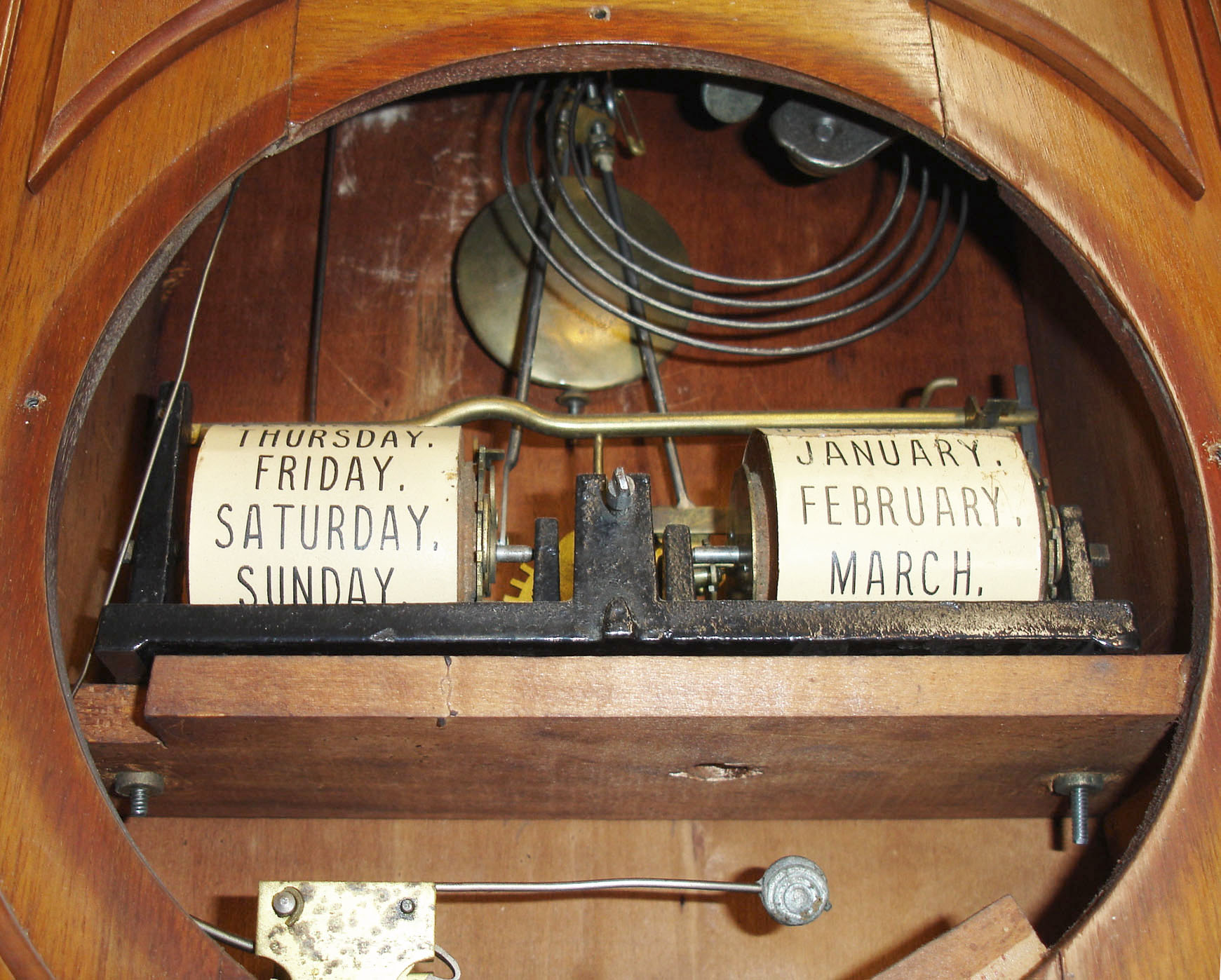 Condition Report: Walnut case in an old finish in nice condition. Time dial has age darkened a little with some minor stains. Clean calendar dial. Original hands. The small button on the bottom bracket is a well made replacement. Clean label inside.