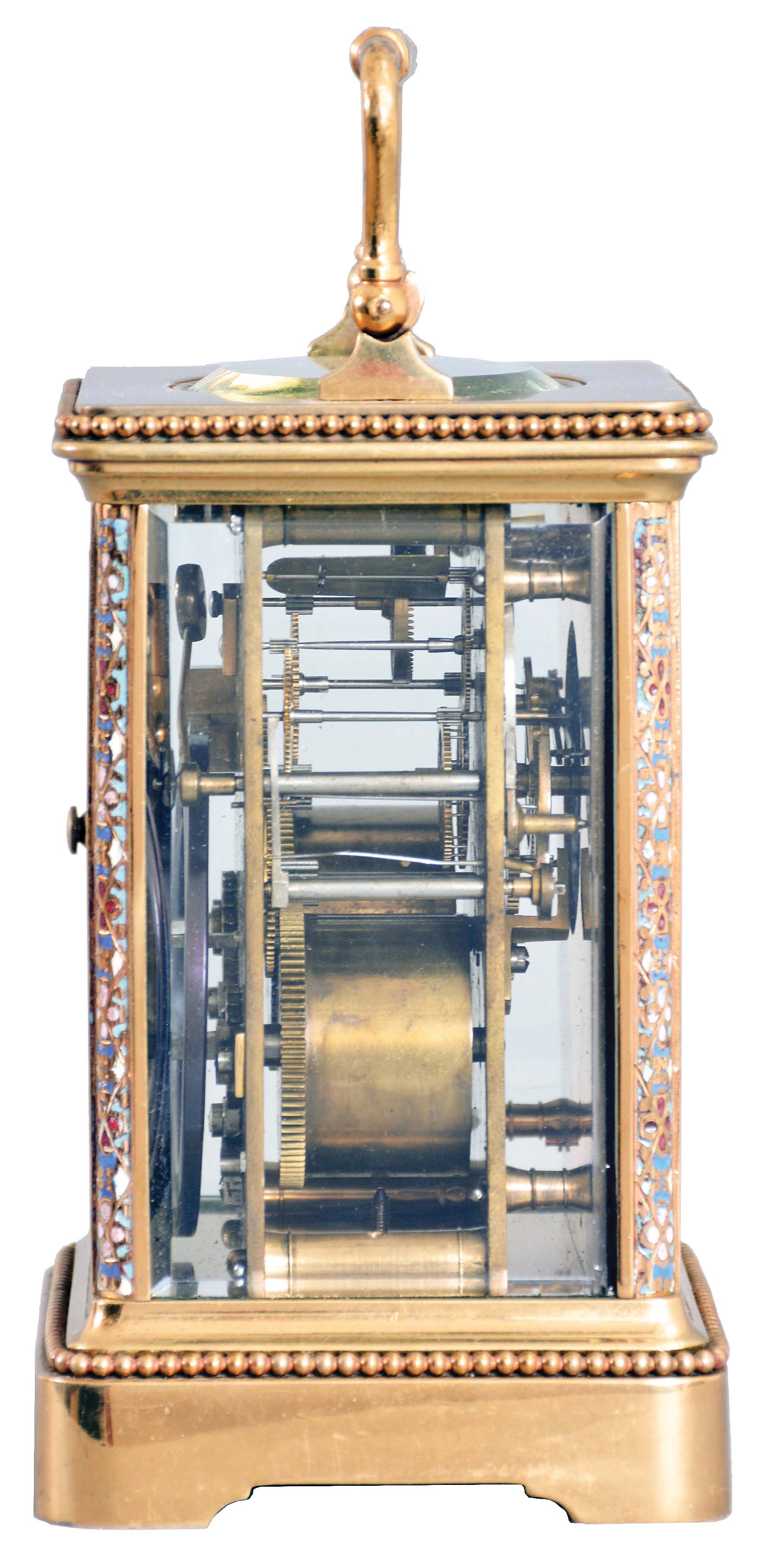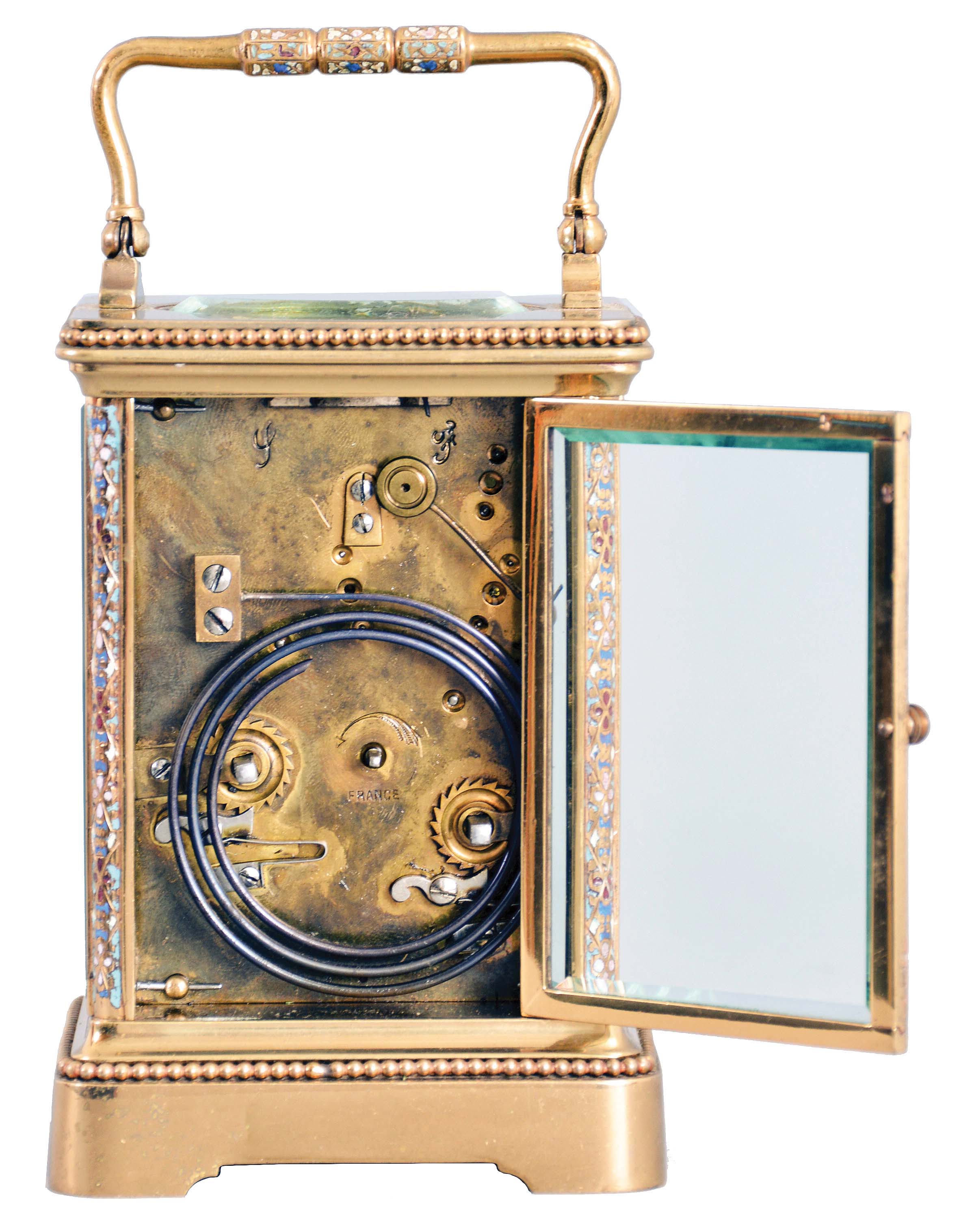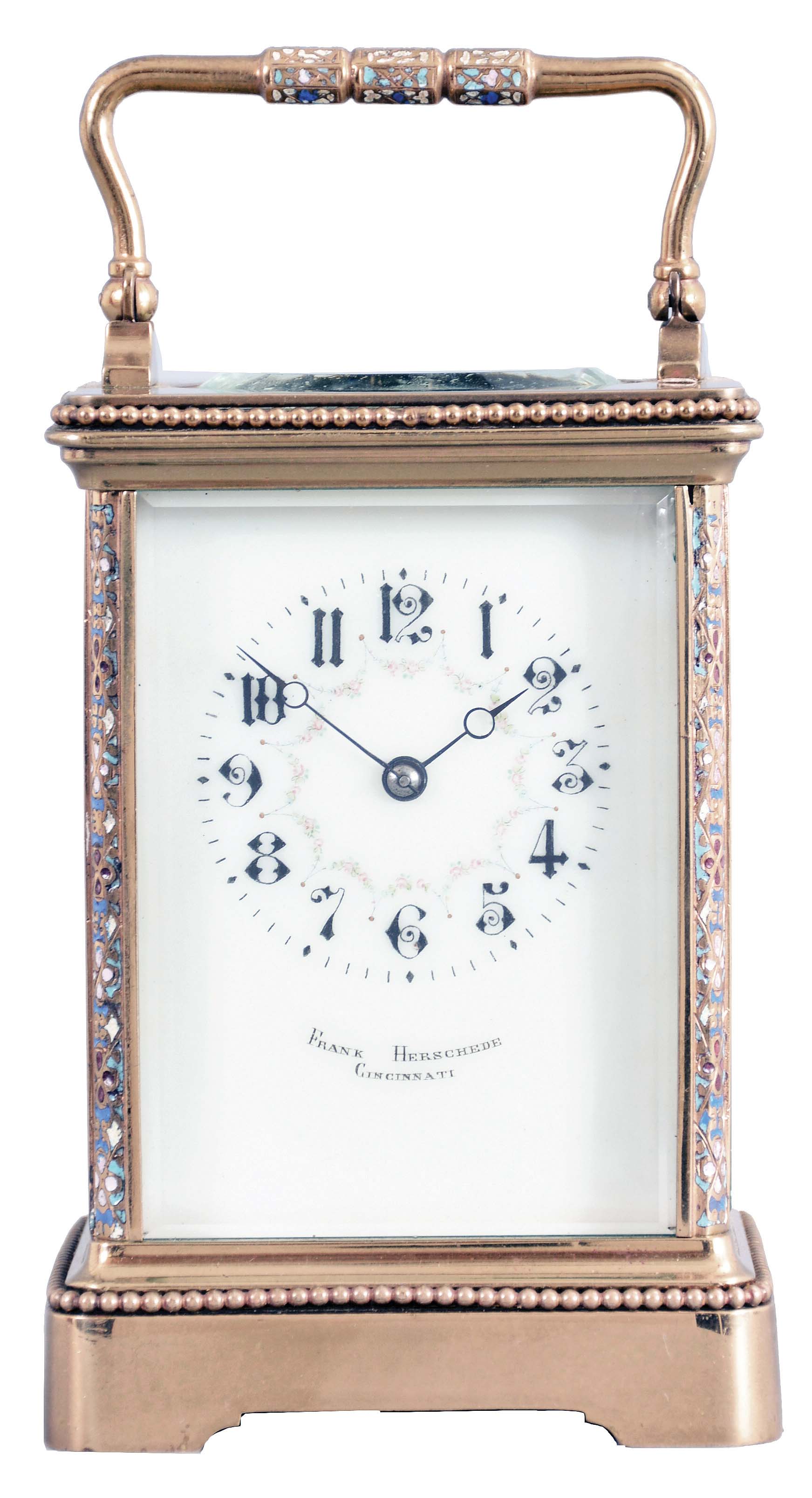 France, for Frank Herschede, Cincinnati, an 8 day, two train carriage clock with champleve enamel ormnament, polished brass Corniche case with enamel accented corners and handle, Arabic numeral white enamel dial with floral featoons, blued steel Breguet style hands, 8 day, time and strike movement with lever platform, counting the hours on a gong