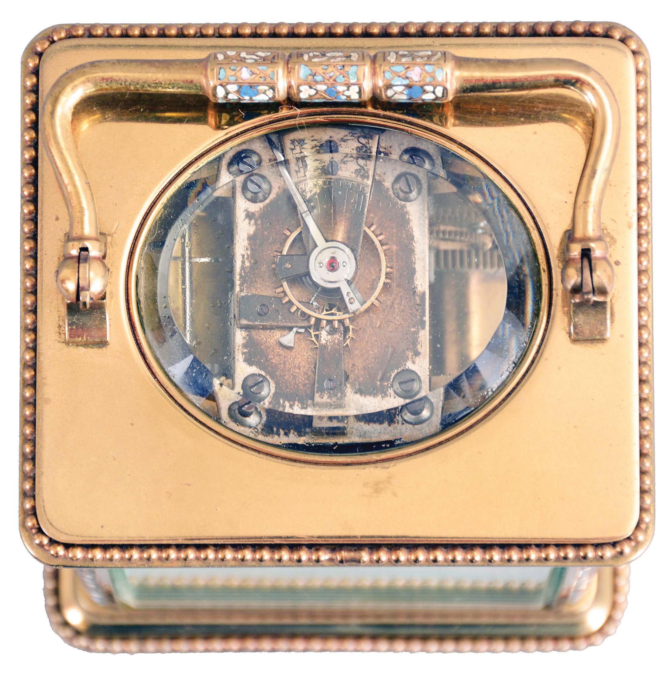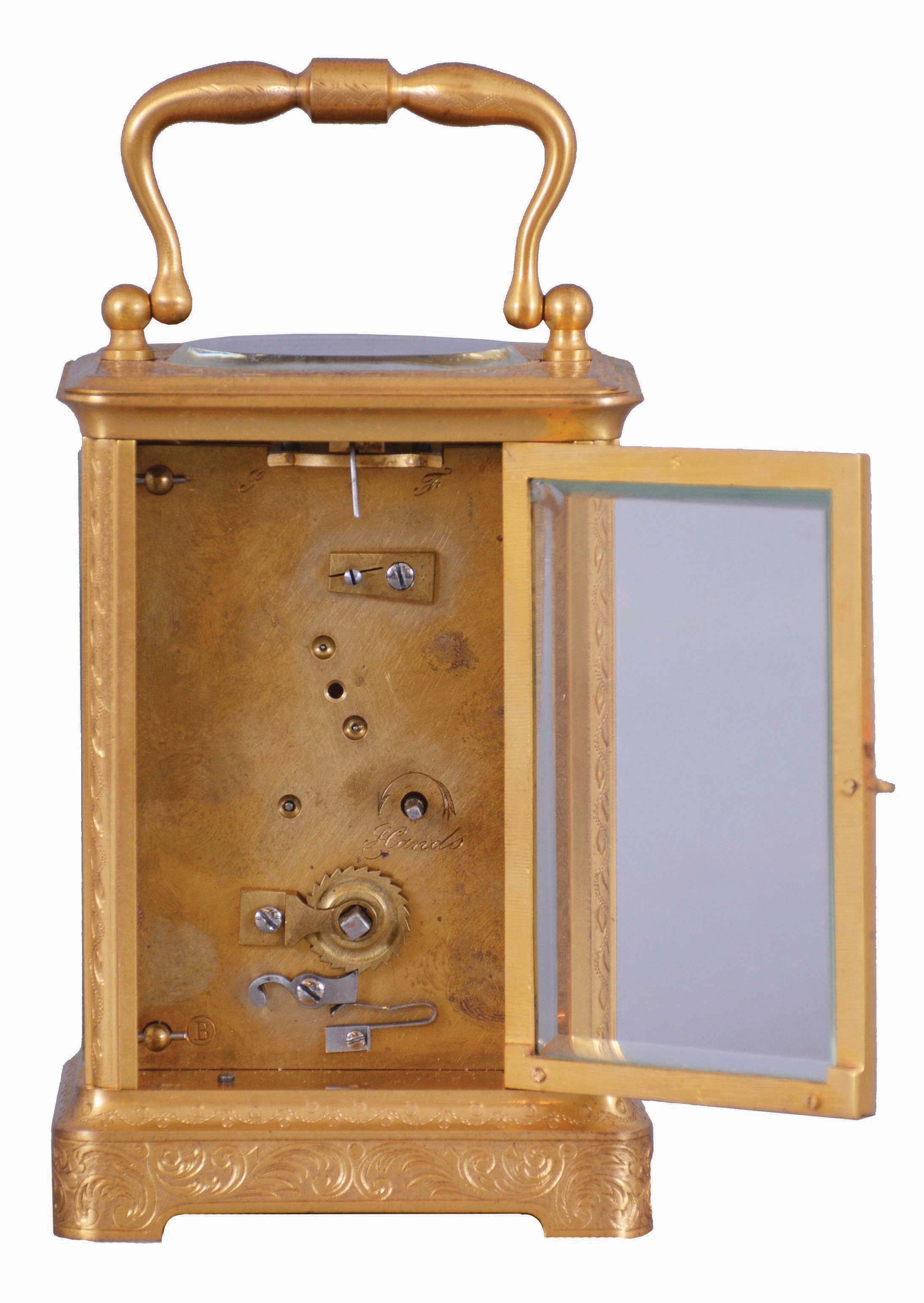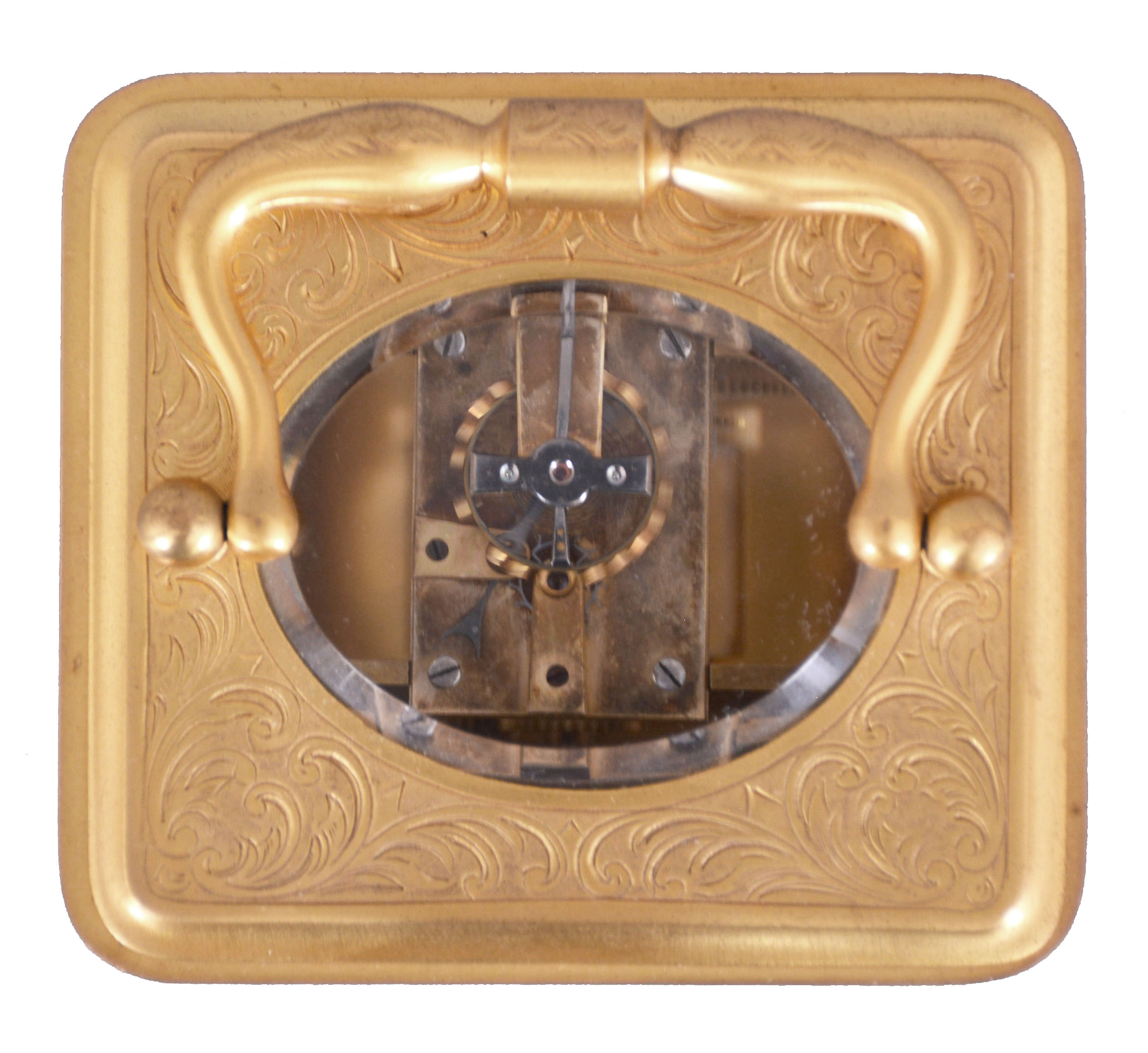 France, for Hall & Co., Manchester, an engraved carriage timepiece for the English market, the glazed, gilt Corniche case with foliate ornament, Roman numeral white enamel dial, blued steel Breguet style hands, 8 day movement with lever platform, the back plate marked "B" within a circle