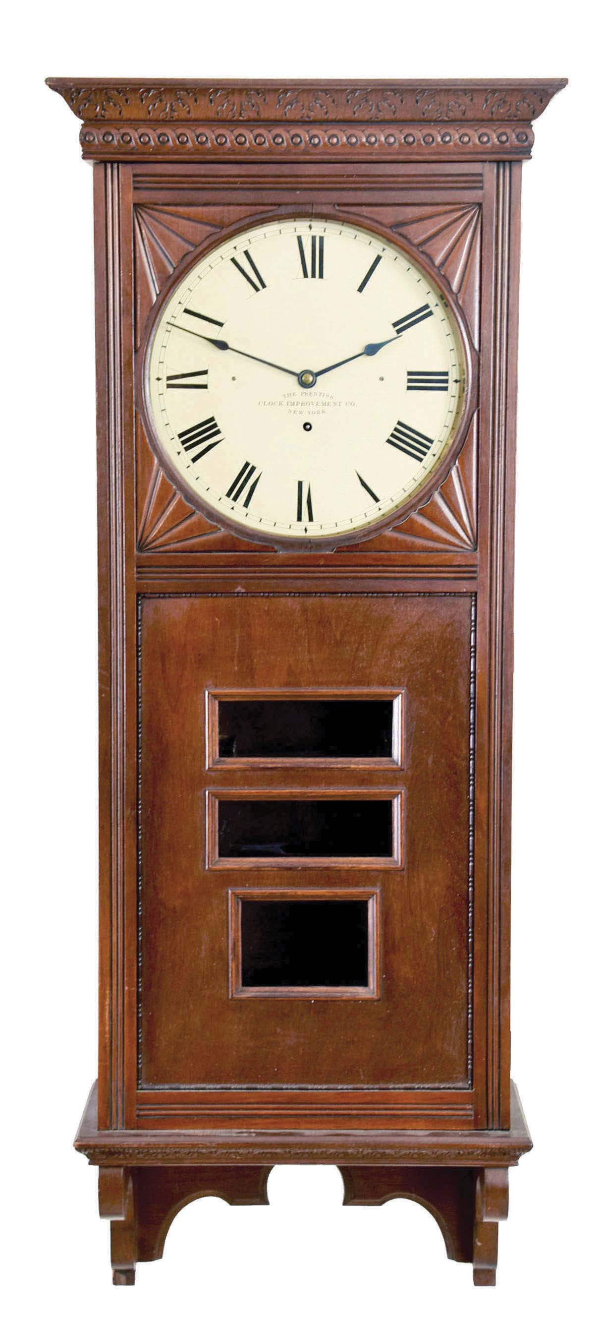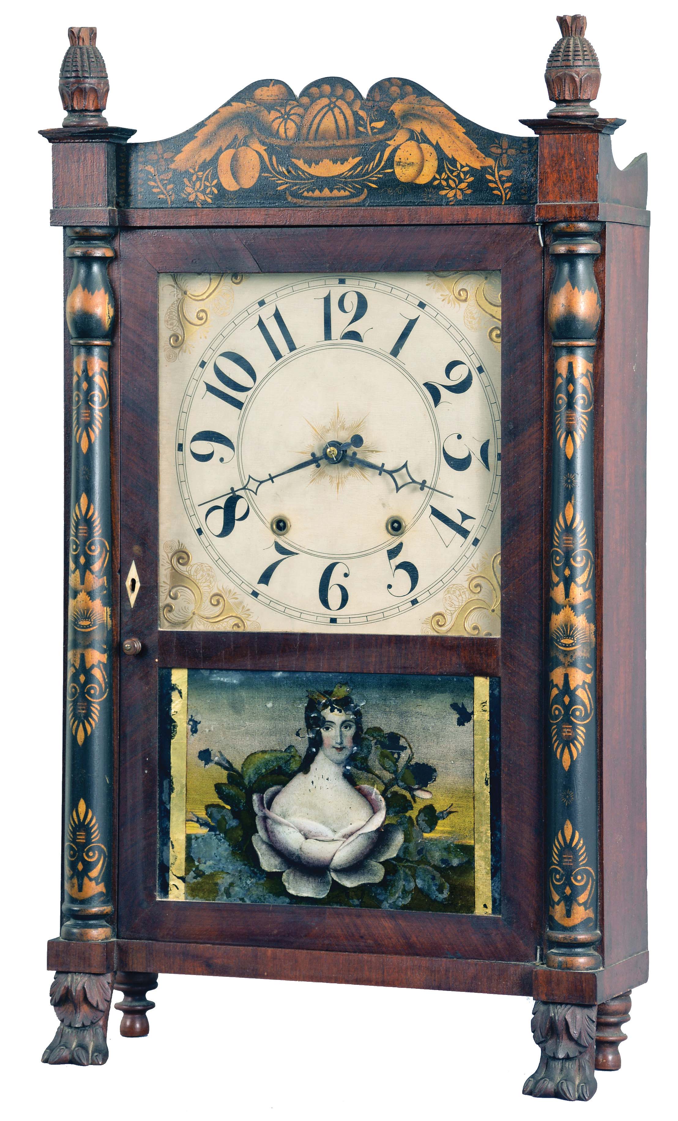 Condition Report: Mahogany and mahogany veneered case with remains of original finish has minor loss on the base, a chip and small veneer repair. Original painted dial has some wear and some minor loss in the center area. Original hands and proper Leavenworth movement. Original tablet is worn and cracked. One toe is missing on the right foot. Slightly darkened label inside.