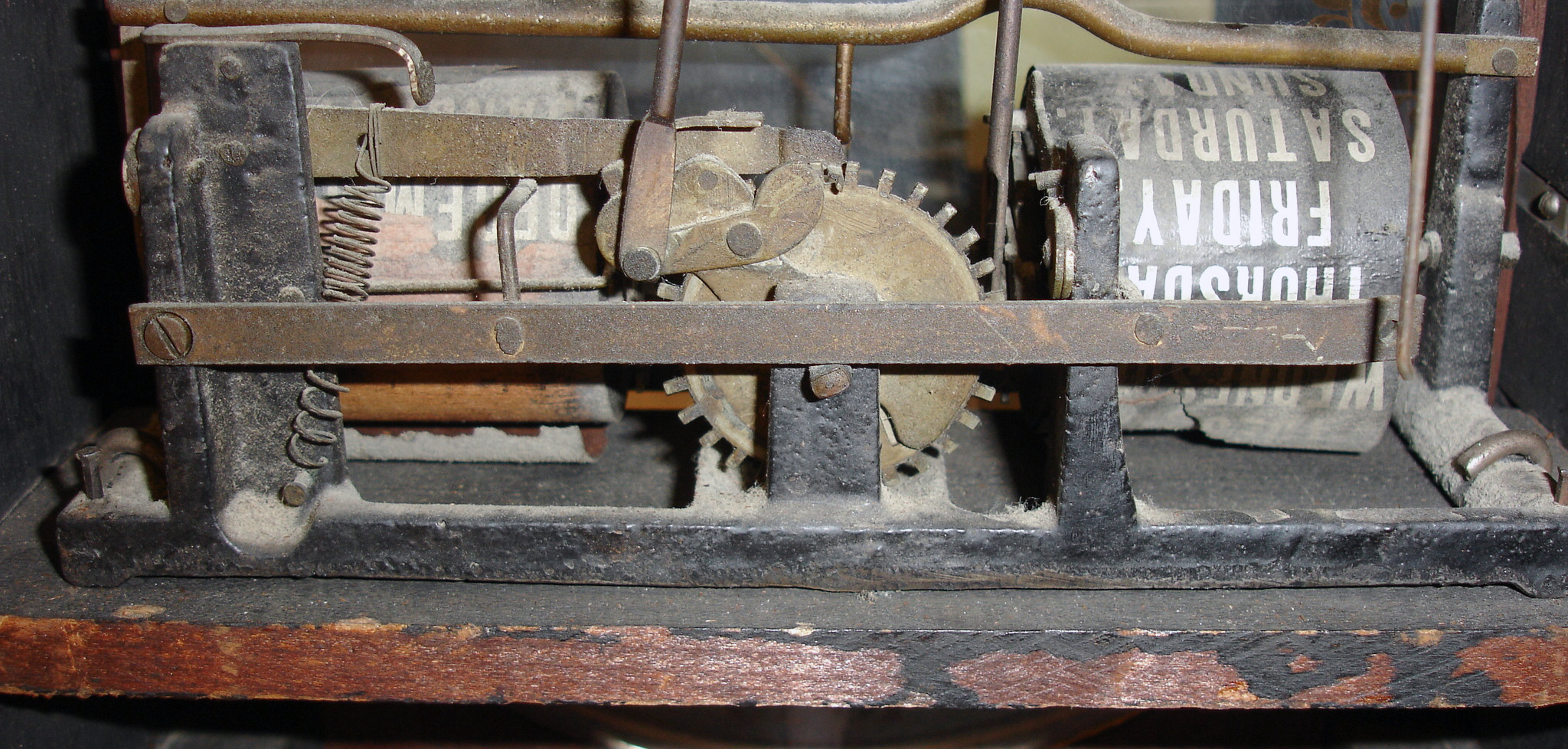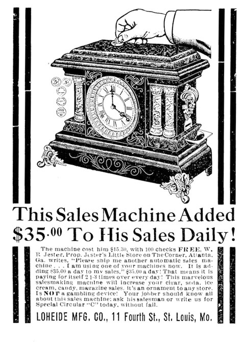 Loheide MFG. Co., St. Louis, Mo., "Automatic Sales Machine" clock and trade stimulator (often called a gambling clock). 8 day, time and token dispenser, spring driven in a black enameled wood case. The clock has a coin slot at the top. When a nickel was deposited, it triggered the strike train of the clock which drives a token dispensing system. A modified countwheel will dispense one, two, and on rare occasion, three tokens in the tray mounted to the side of the clock. Tokens were then exchanged for small items at the retail location.