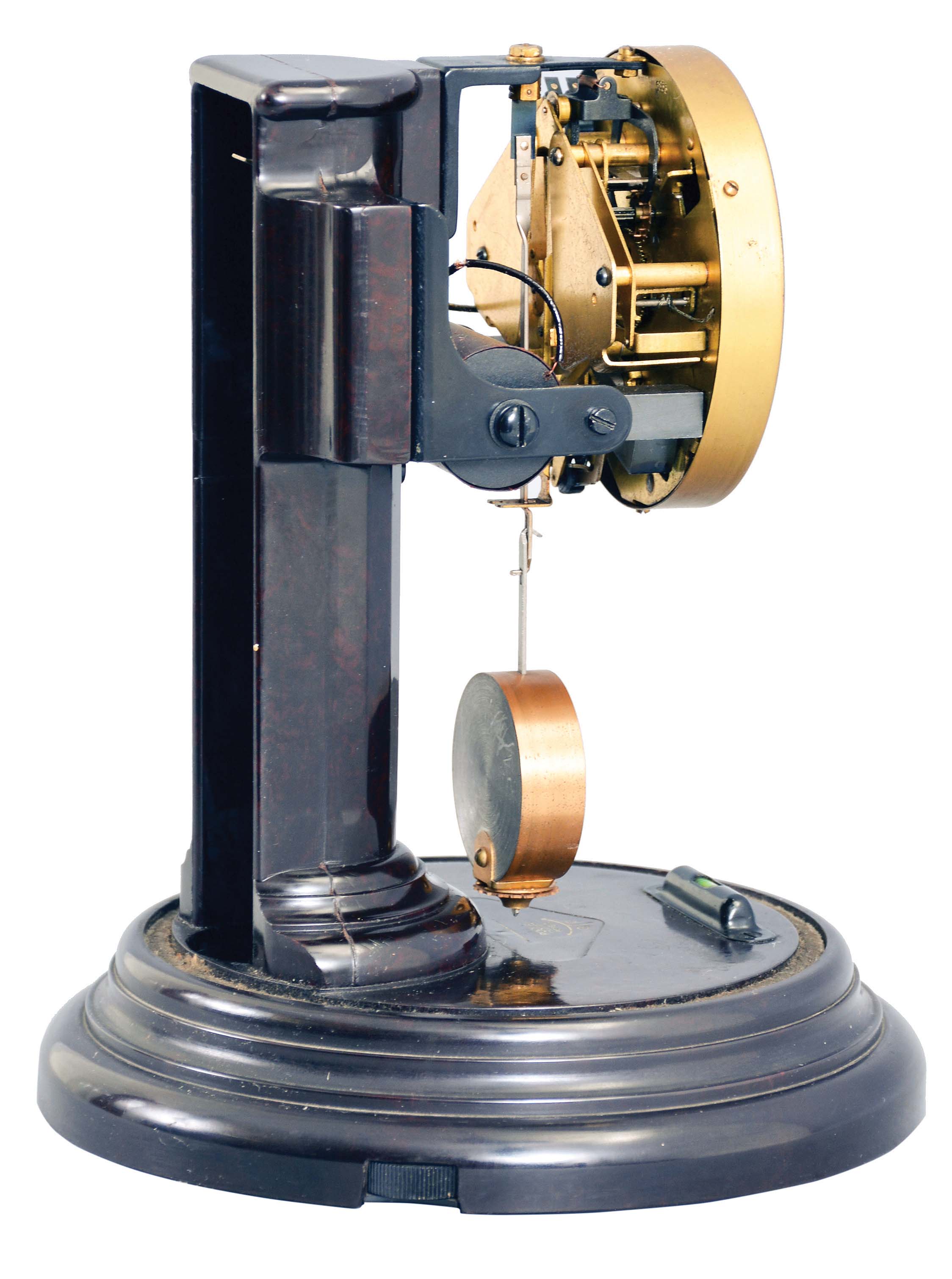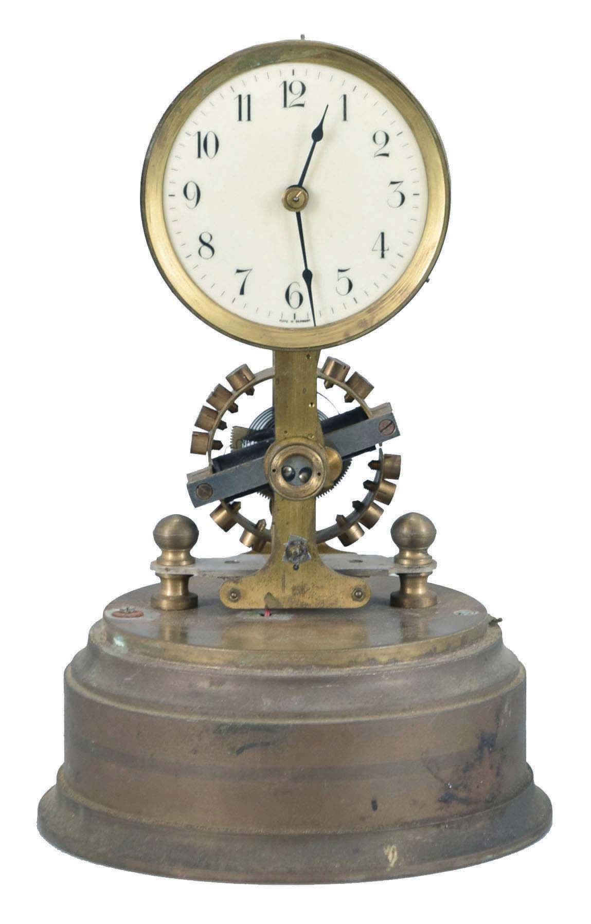 Germany, Eureka style, battery powered, electro-magnetic timepiece mounted on brass base with a large exposed rotating balance.