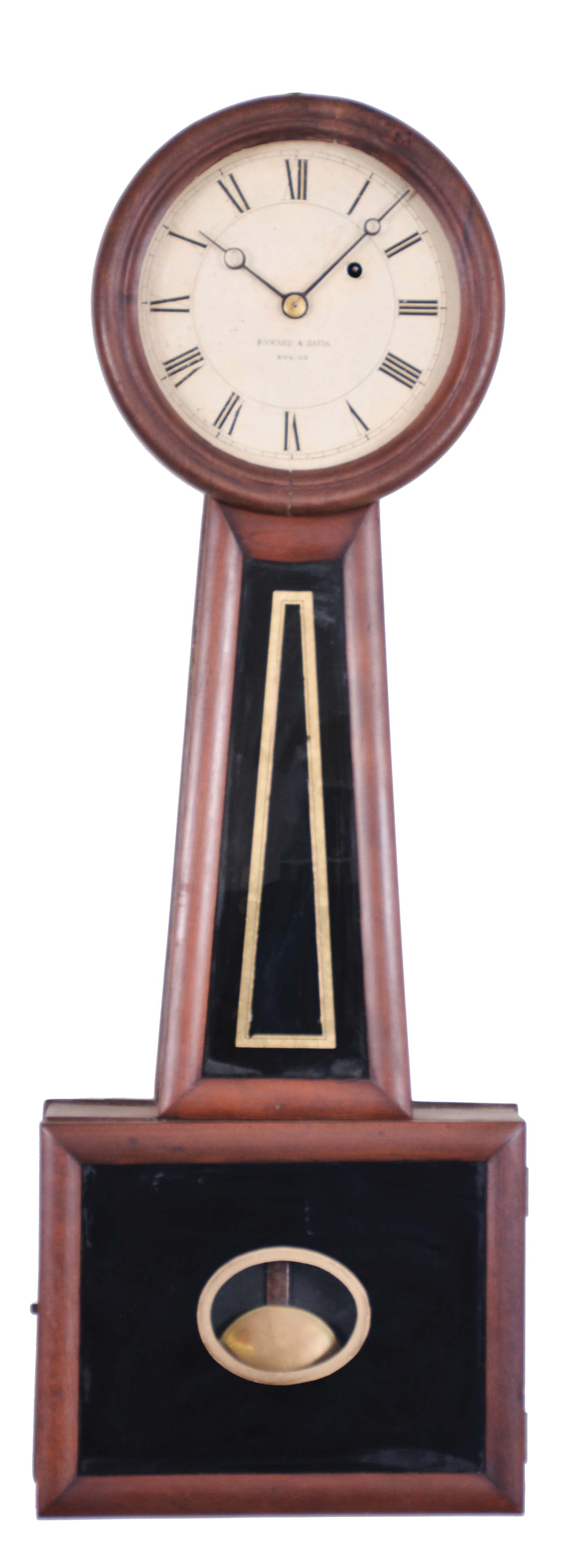 Patent Timepiece or "Banjo" Clock, Concord, Massachusetts, the mahogany veneered, gilded rope molded case with acorn finial over the zinc roman numeral dial, original reverse-painted glasses, the lower depicting "Aurora" on her festooned chariot driven by two winged horses set before a gleaming sunrise and framed within a geometric border, the waist glass flanked by brass side ornaments in gold, green and red frames gilt scroll work within a gilt border, below is a gilded pedestal with fluted acorn drop and eight balls, eight day brass movement with alternate train layout, cut-outs on front and back plates, and recoil escapement and regulated by a brass-faced lead backed pendulum bob and iron rod.