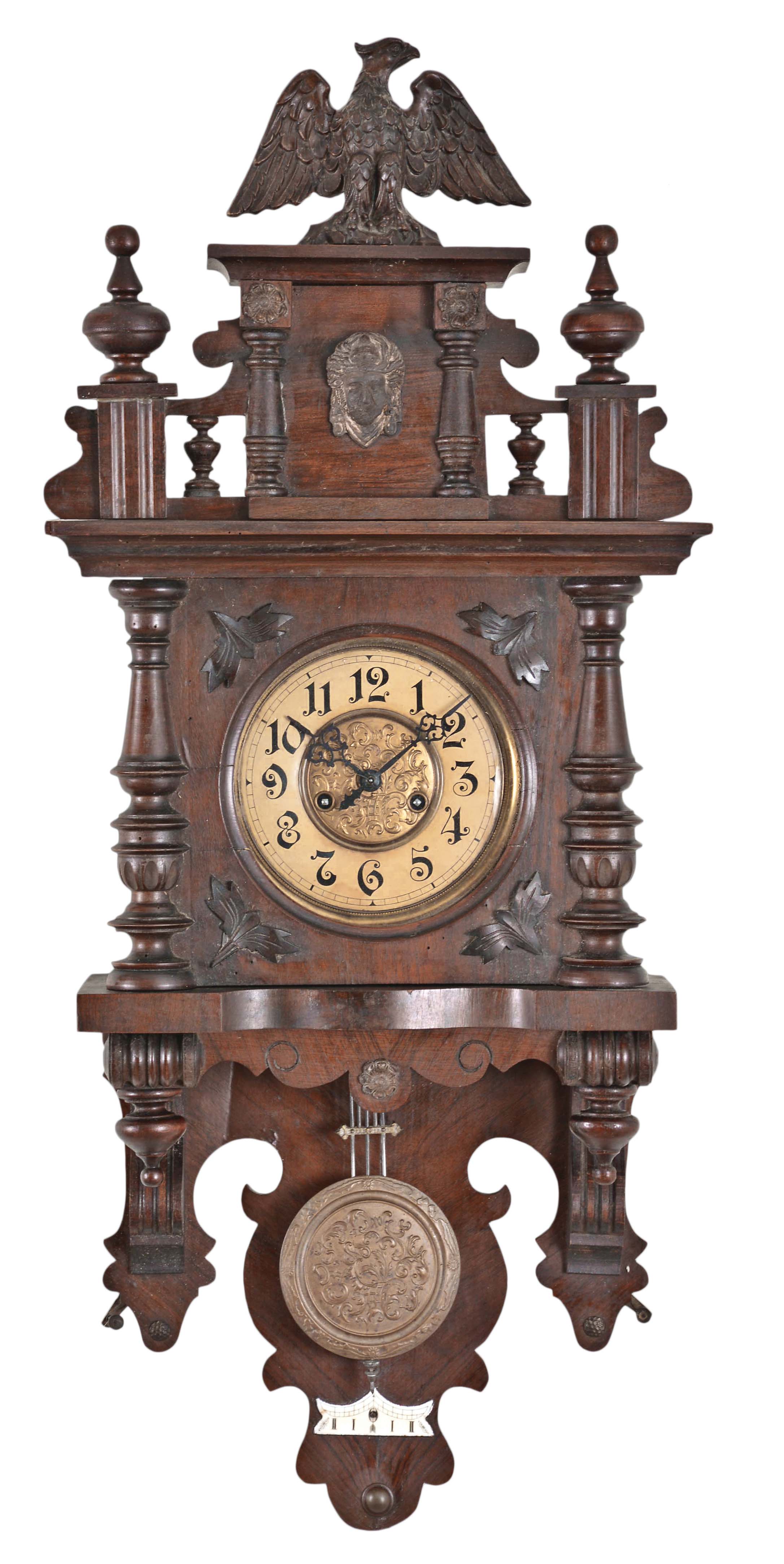 Germany, "Berliner' open well wall clock, 8 day, time and strike, spring driven movement in a walnut case with brass dial and matching embossed dial center and pendulum bob