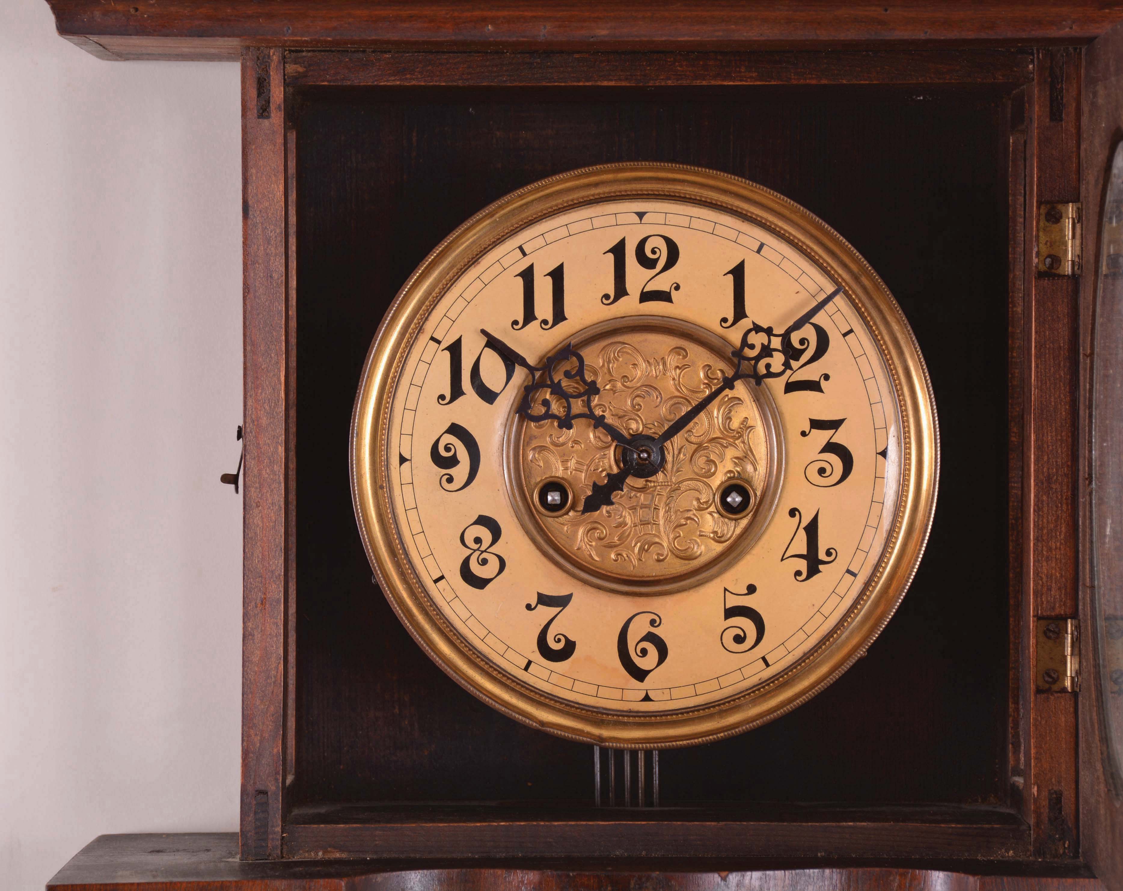 New Haven Clock Co., New Haven, Conn., "Elfrida" hanging clock with a spring driven 30 day timepiece movement in an oak case.
