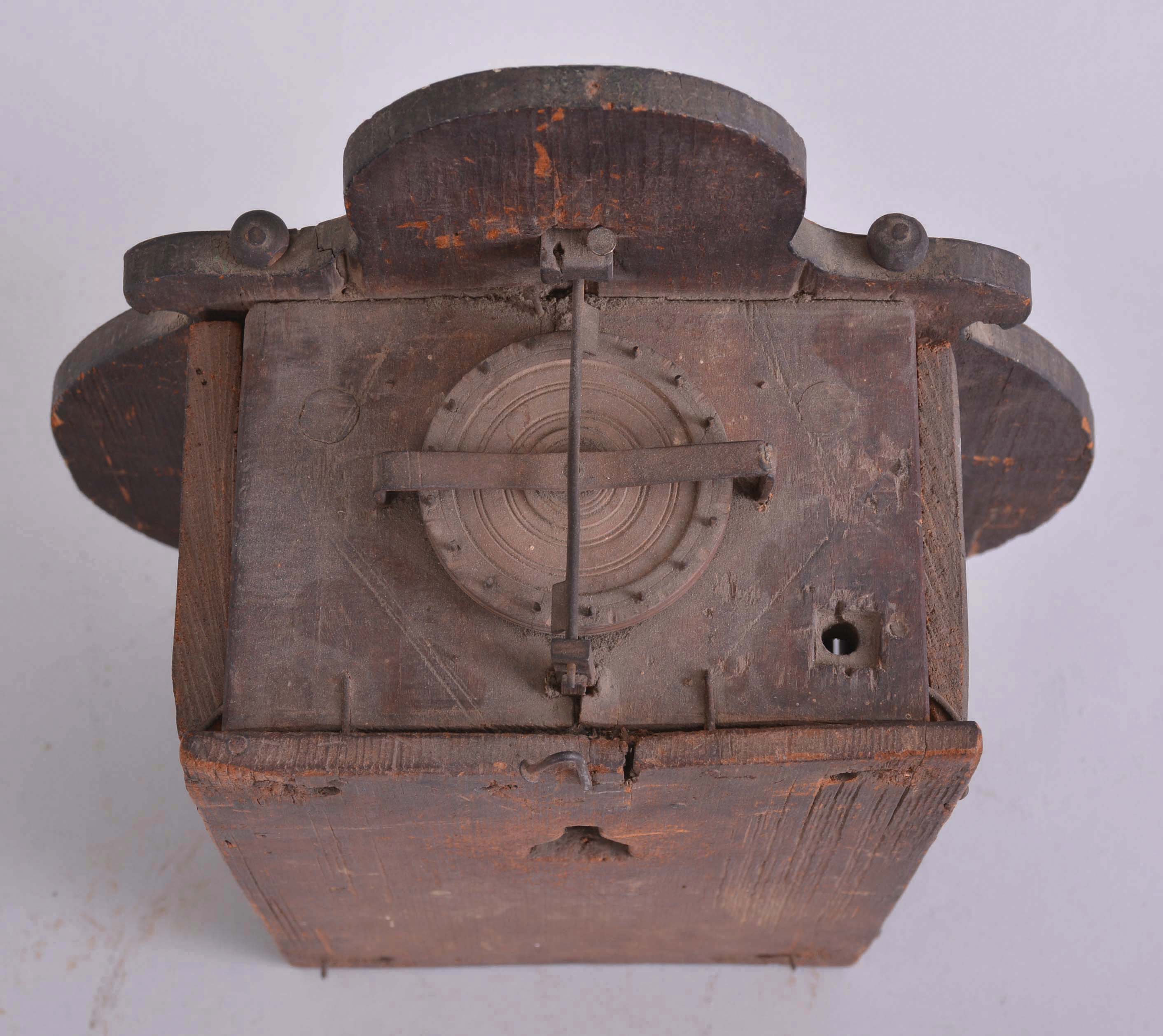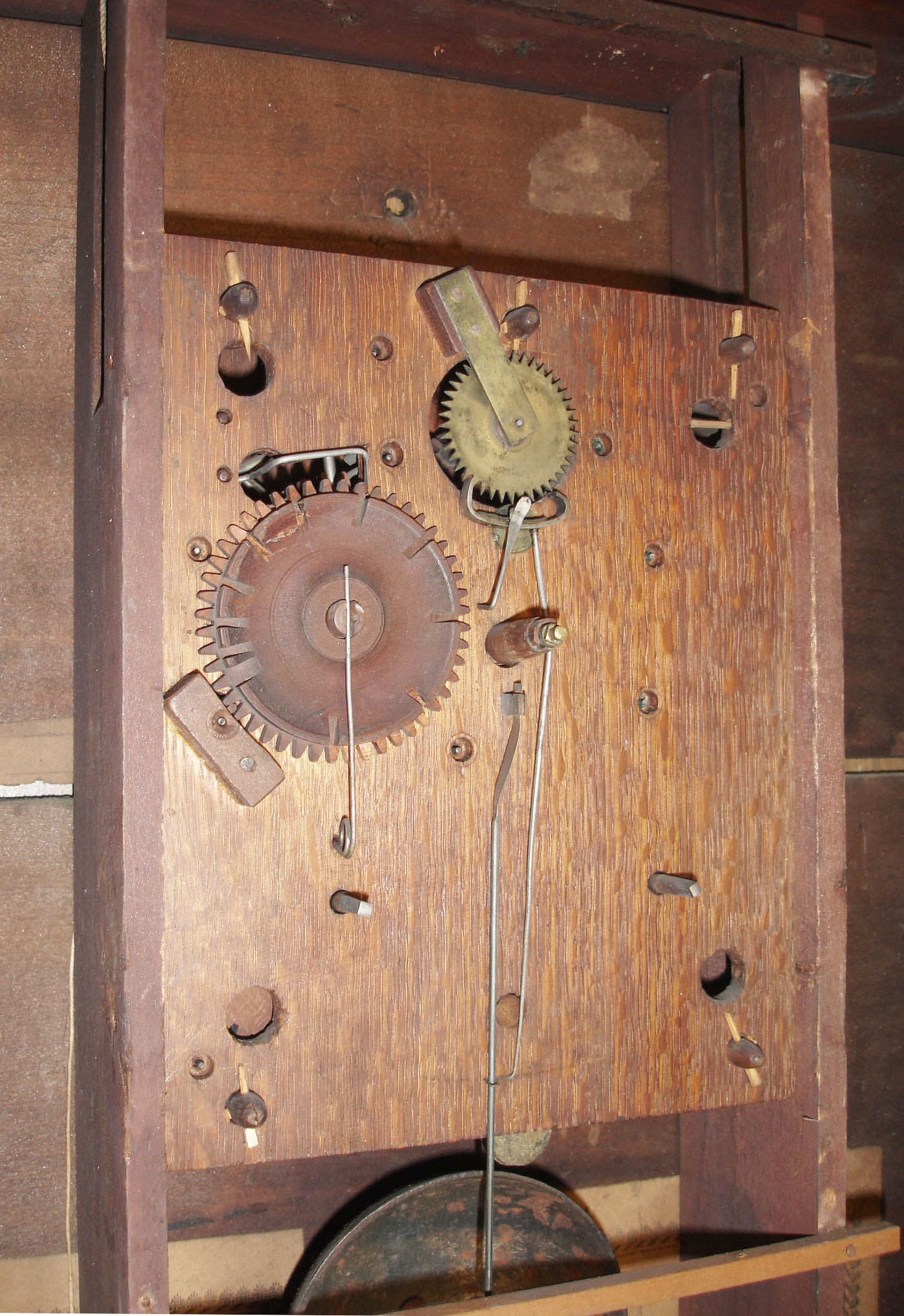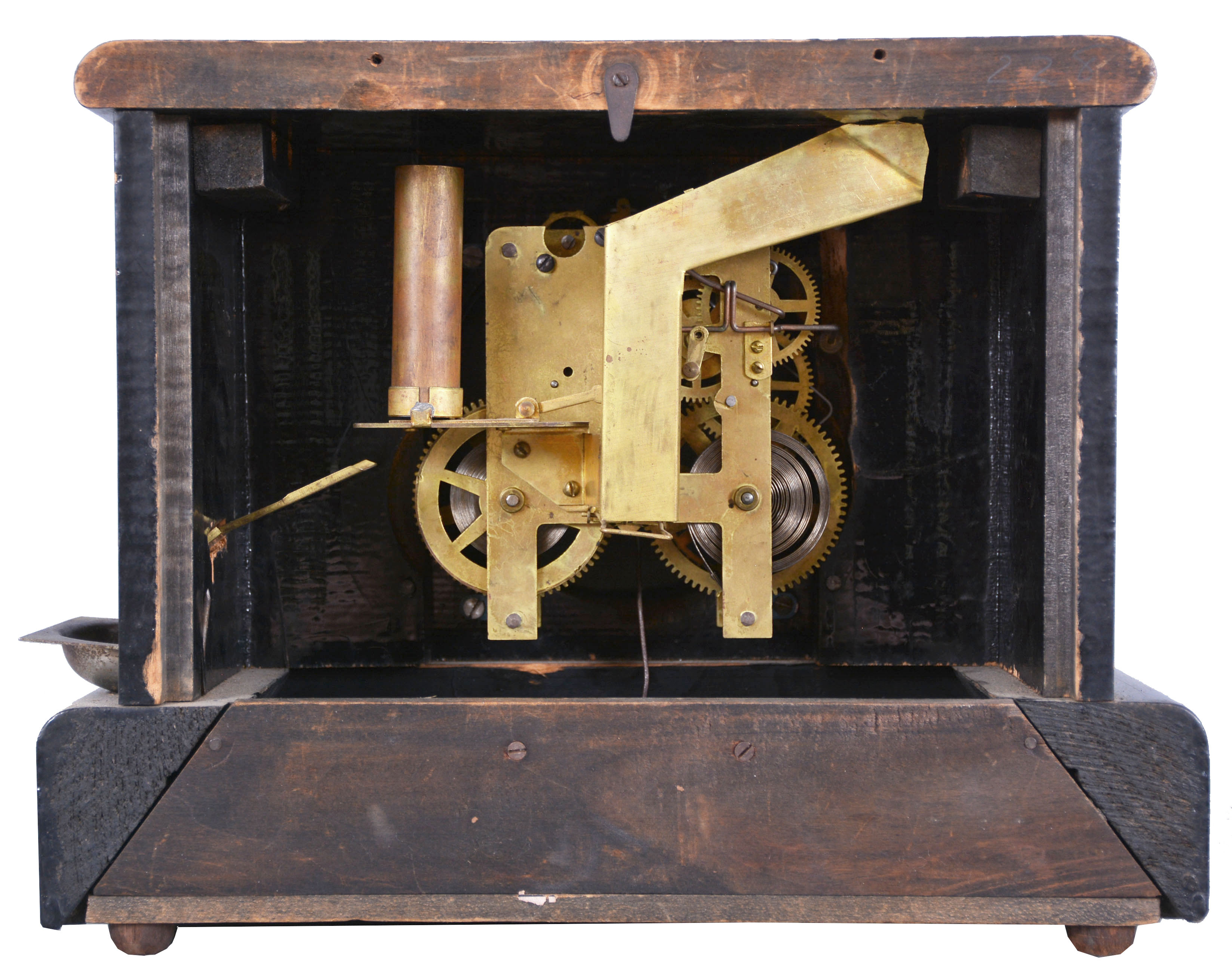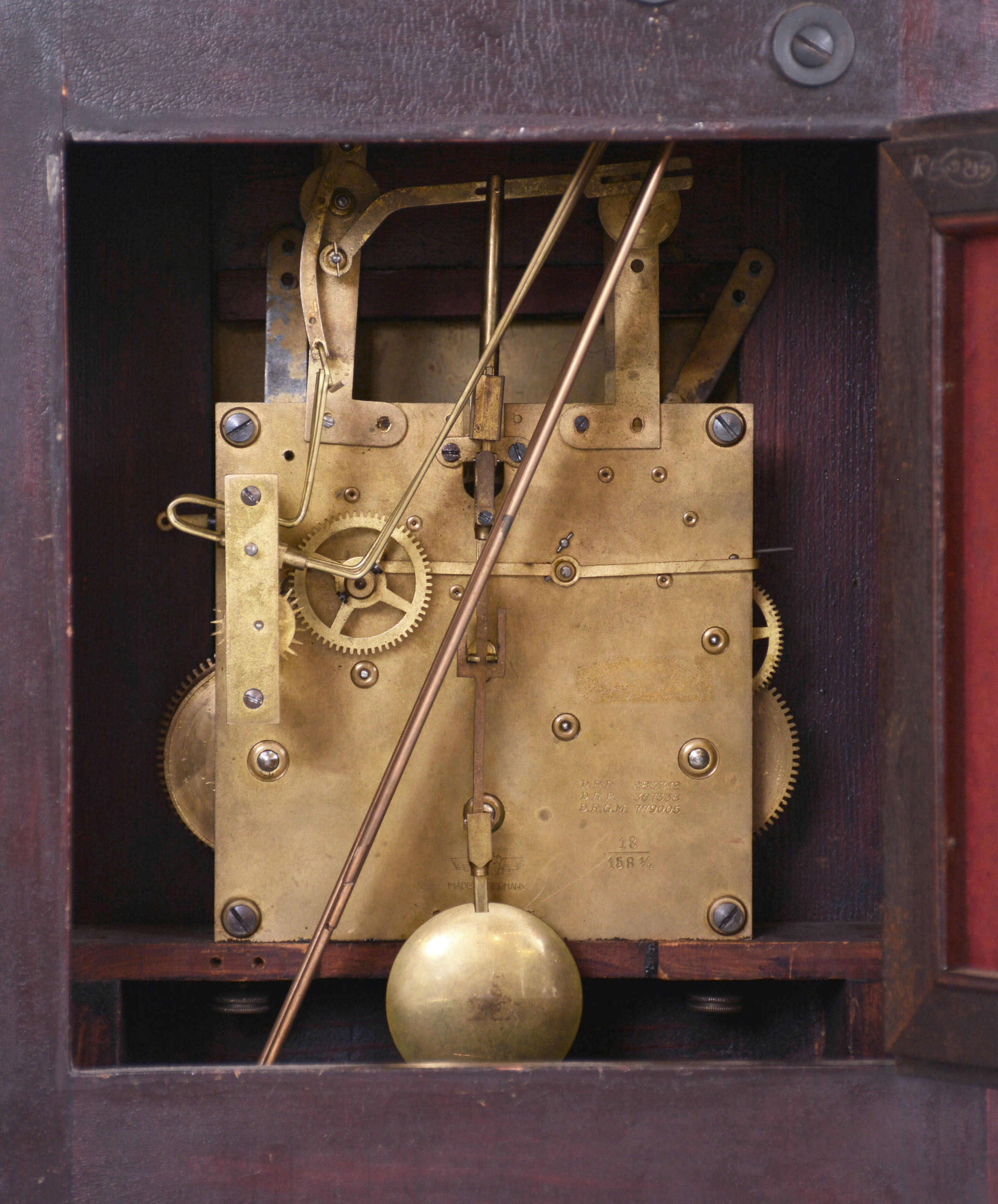 Condition Report: Oak case in original worn and decayed finish has some paint in a couple small areas on the case likely from someone painting around the case in the past. Original paper dial is fairly clean for its age has some stains and surface abrasion. Original hands and pendulum. Movement is signed. Dark label on the back.