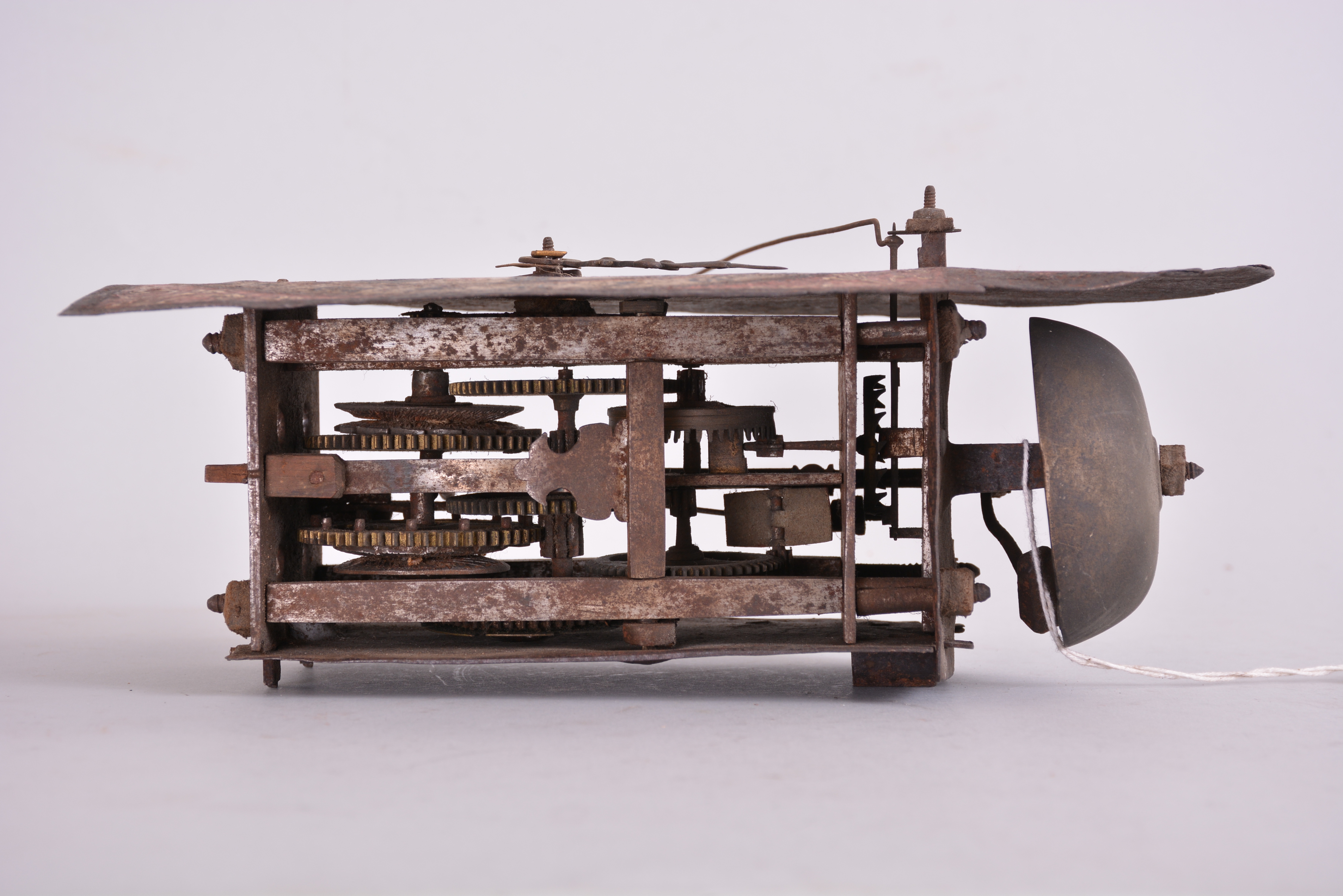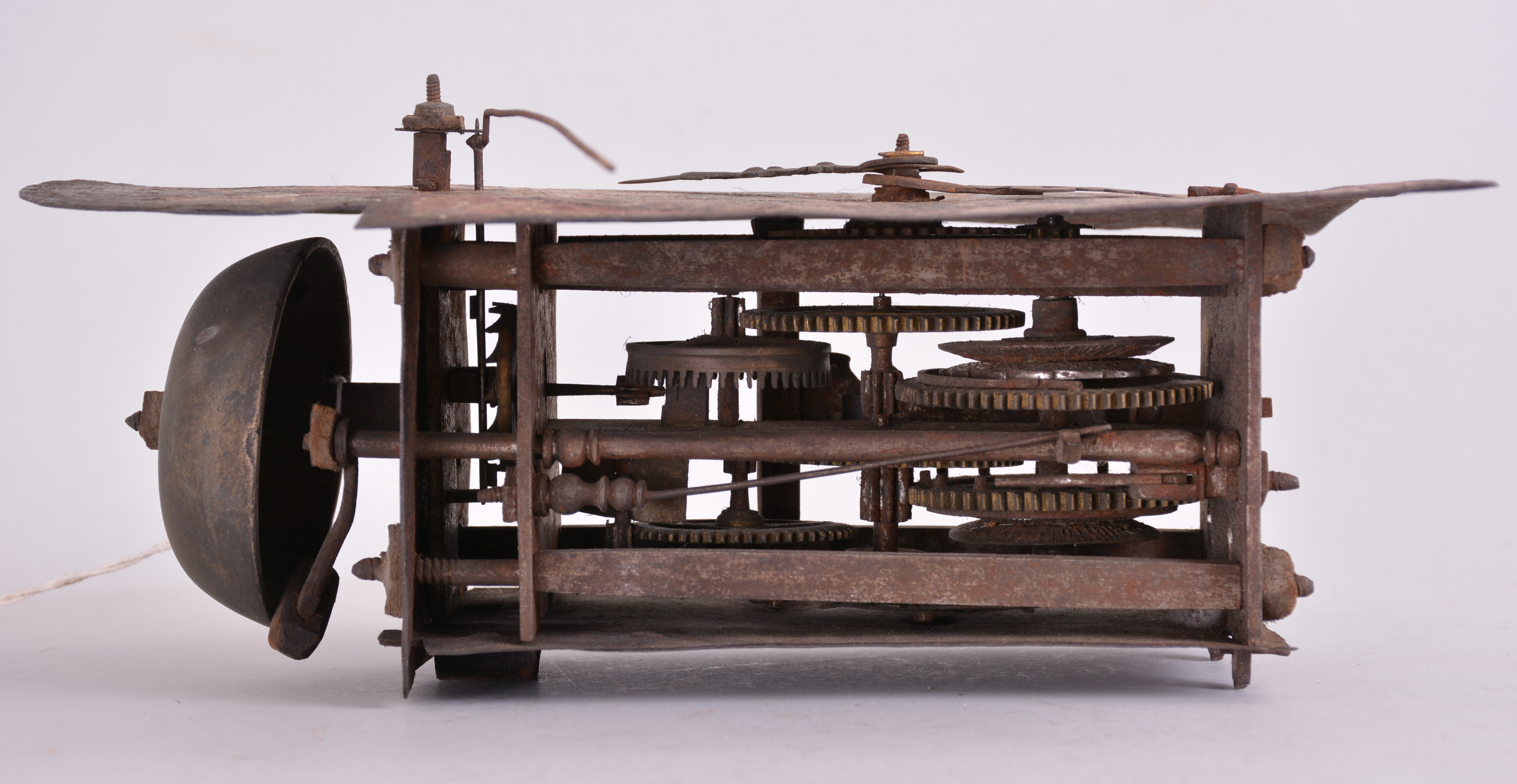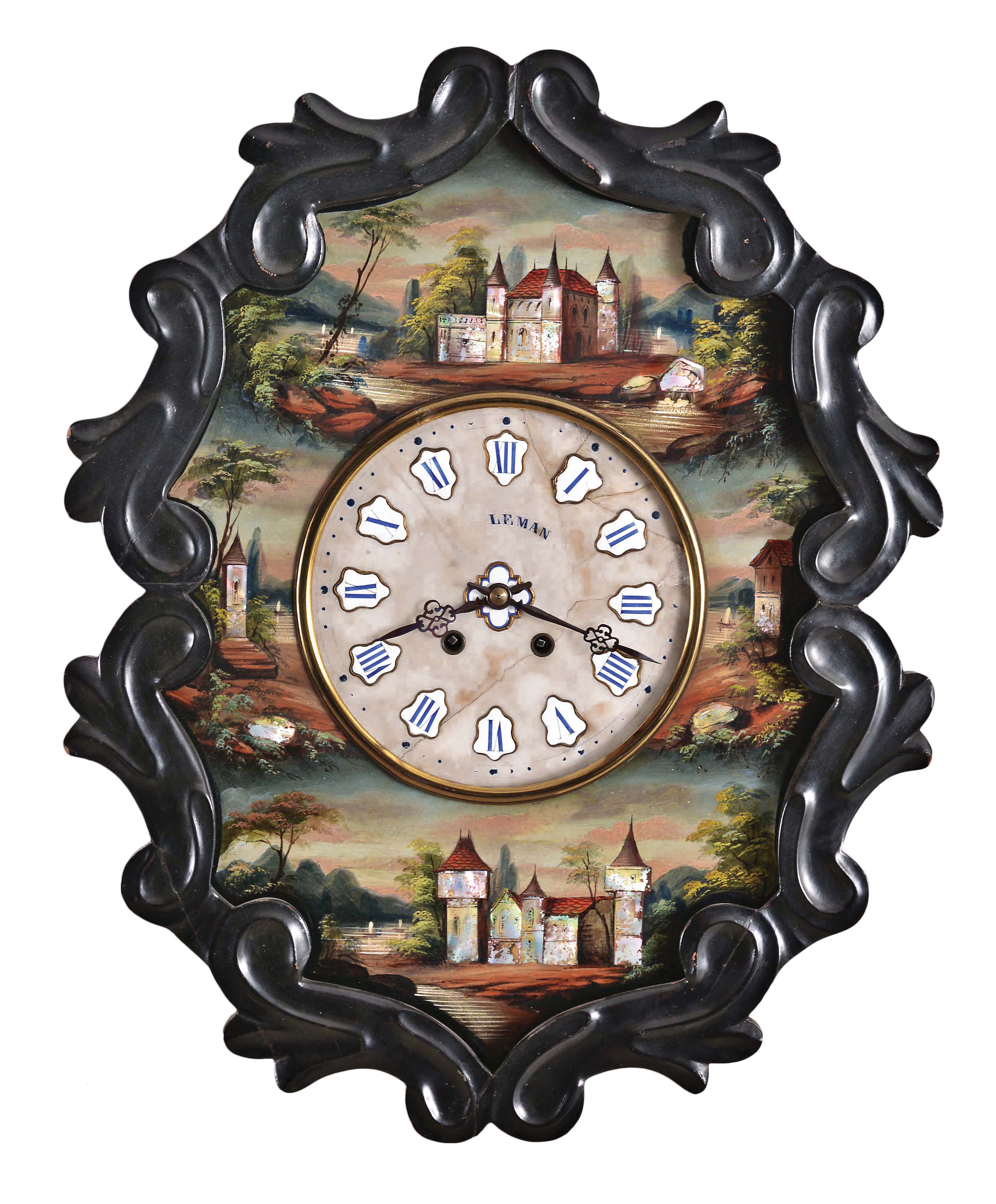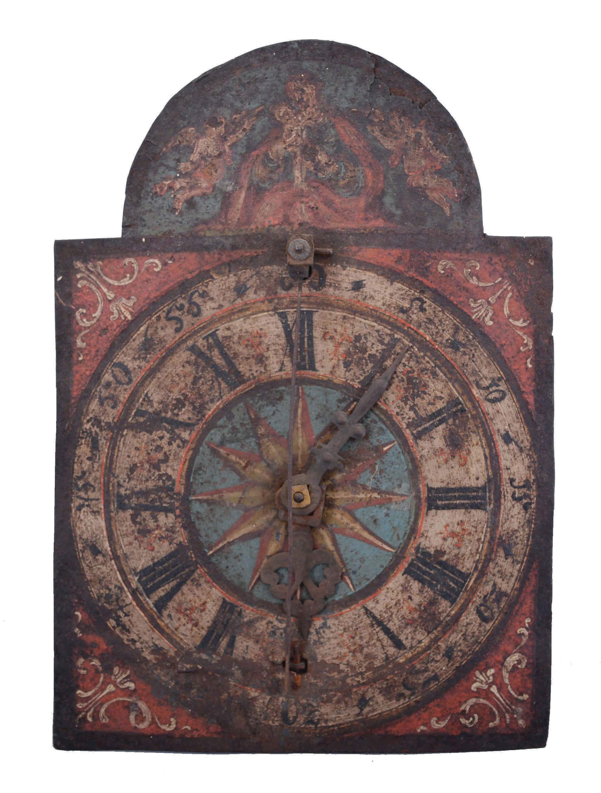Condition Report: door frame with losses and tarnish, inner frame with splits at corners and minor losses, painting with dirt and minor losses, dial with hairline and minor flakes, hands with oxide, movement dirty, ticks and strikes, needs service, pendulum missing