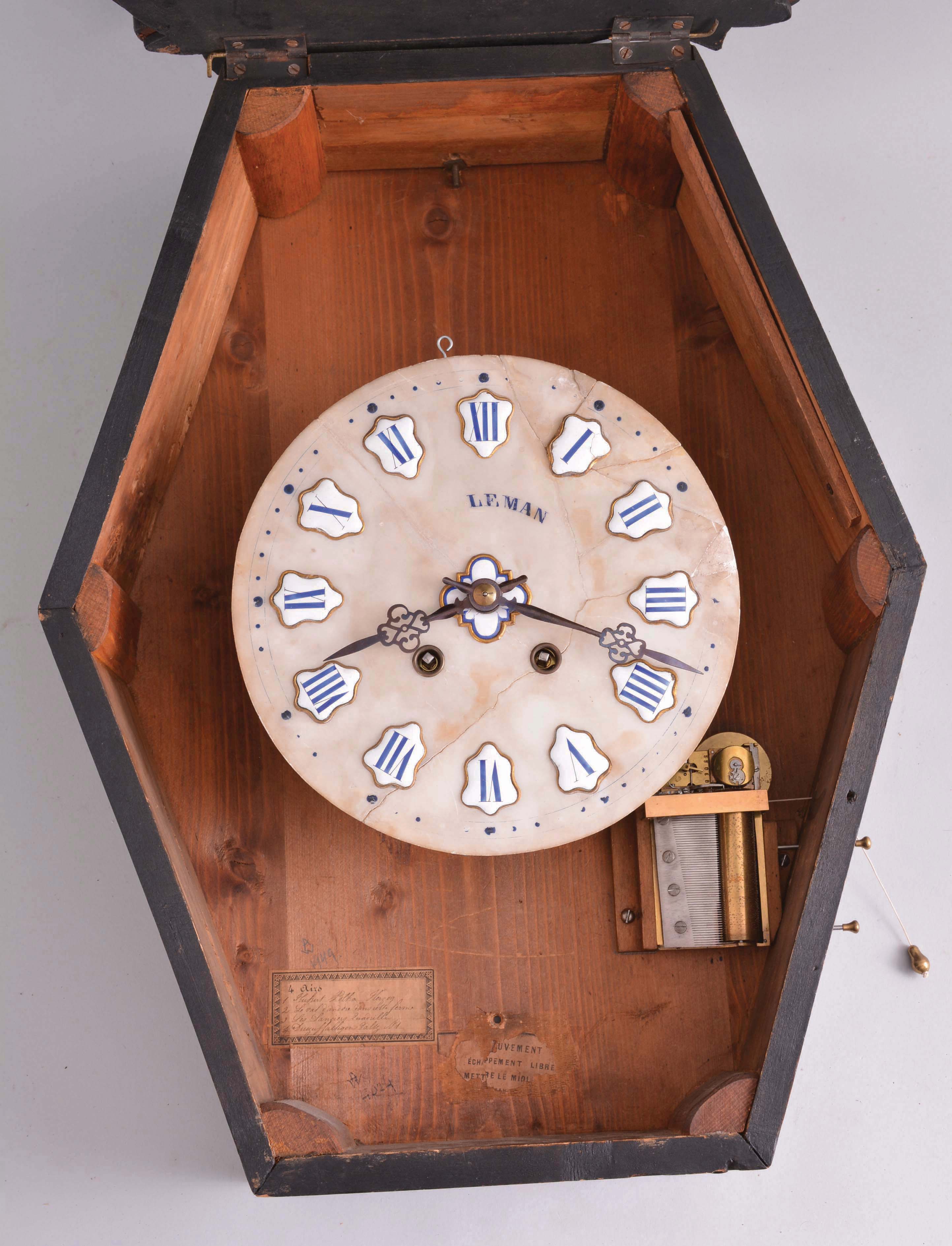 France, morbier baker's wall clock, 8 day, time and strike, spring driven movement with music on demand by pull repeat in an ebonized wood case with painted dial surround and raided cabochon numerals on a glass dial signed "LEMAN"