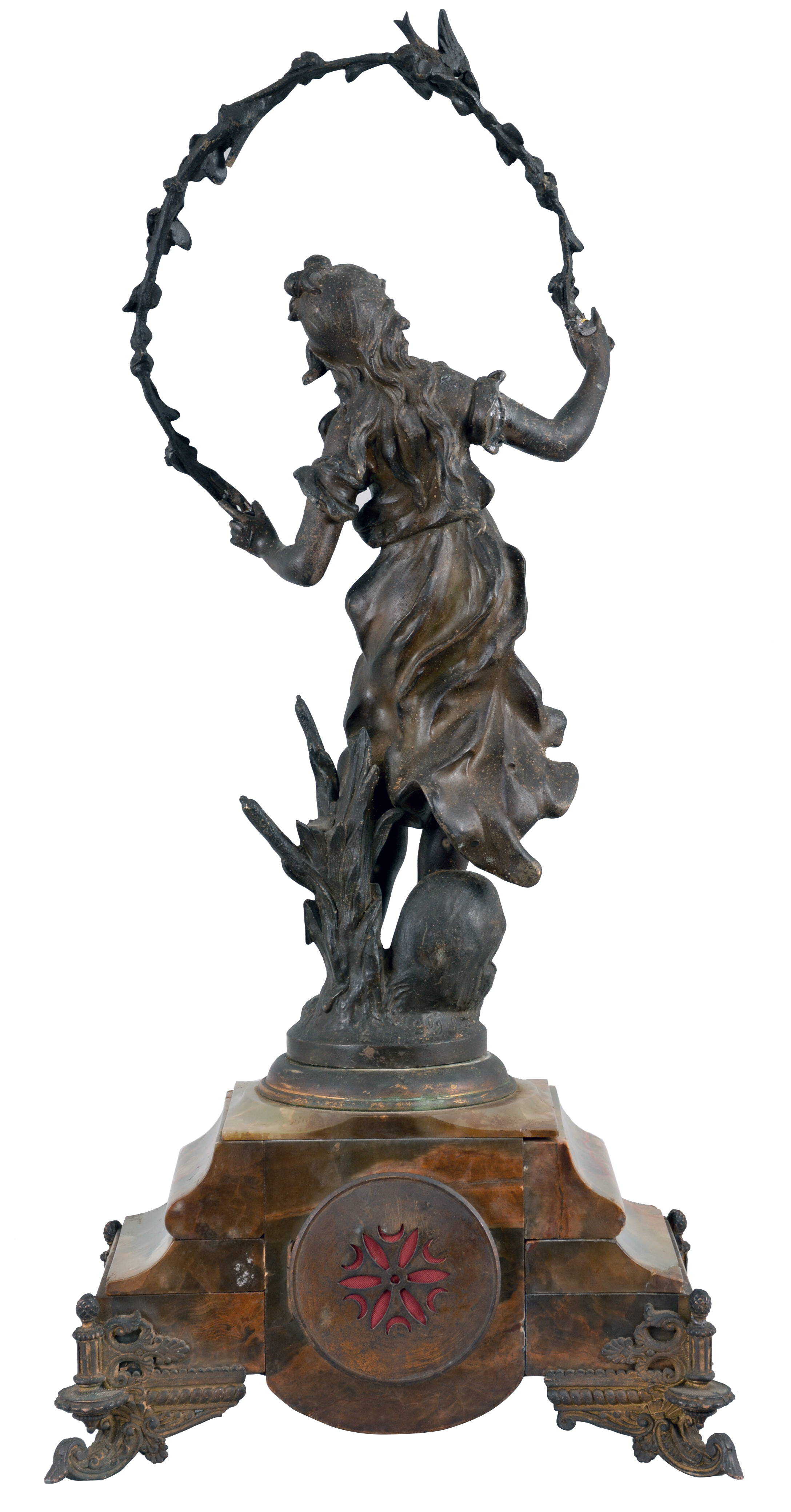 Condition Report: Floral garland needs proper re-attachment, glue residue remains. Onyx case needs a thorough cleaning as it has been in a smoker's house for generations. Figural patination could be cleaned, some remaining gilding on pedestal could be brightened a bit. Movement needs thorough overhaul.