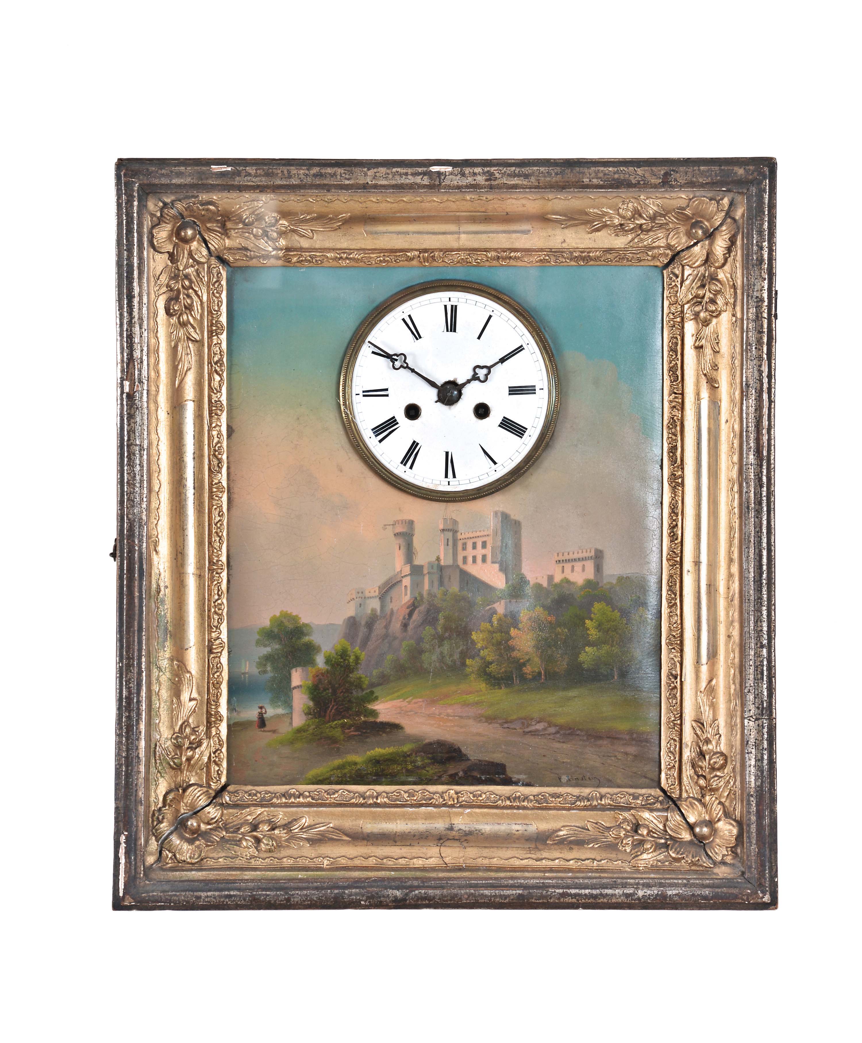 Germany, a very decorative picture frame clock, the deeply molded, gilt frame with applied floral and foliate ornament, with a good oil painting on zinc, depicting a large castle on a cliff overlooking a lake, surrounded by a verdant landscape, and signed at lower right, Roman numeral white enamel dial, blued steel trefoil hands, 30- 60 hour brass, spring driven time and strike movement with silk thread suspension