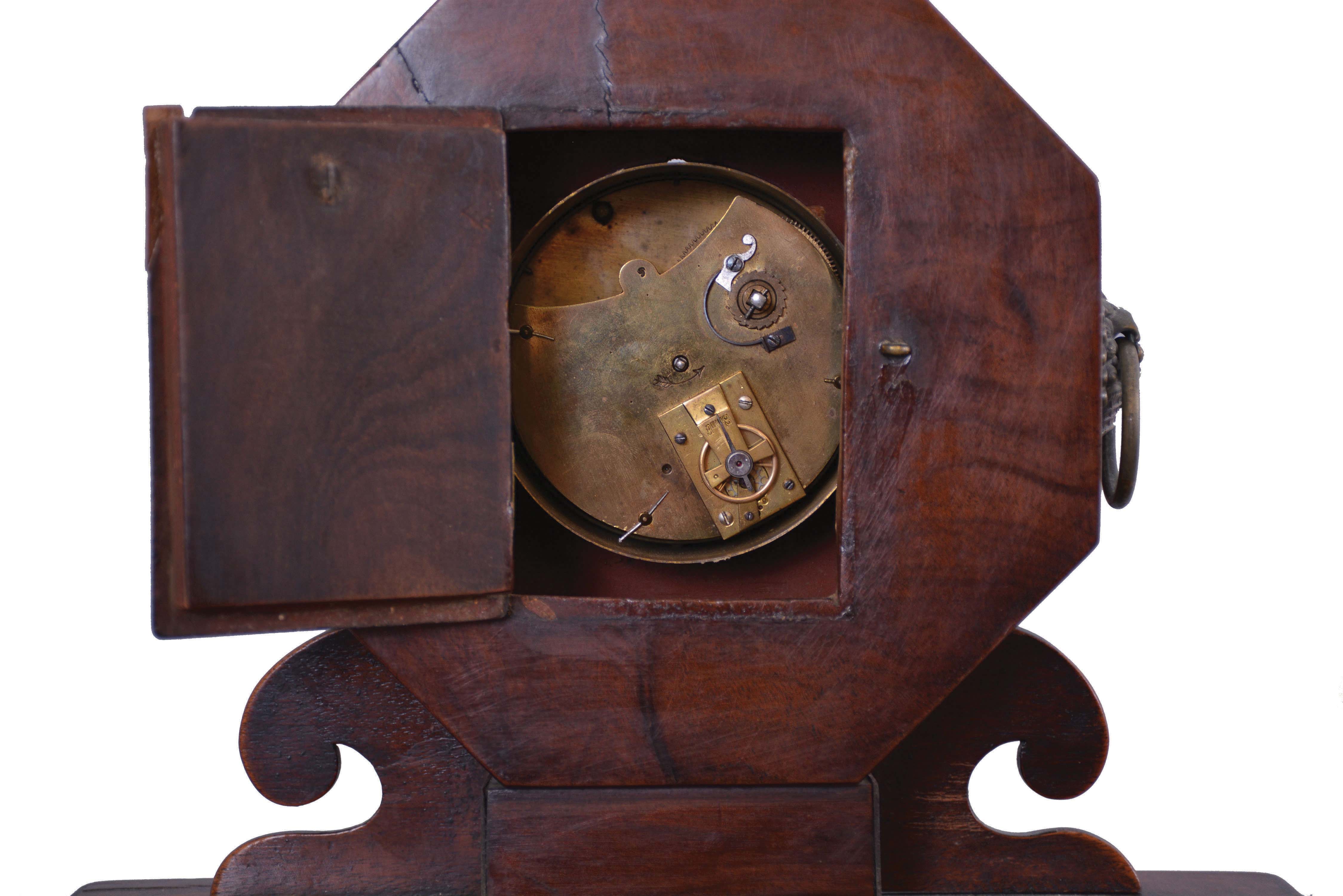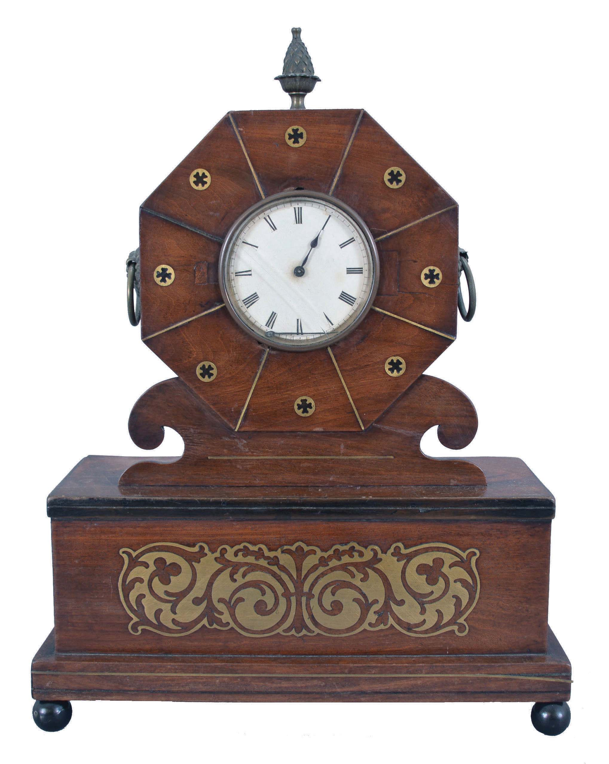 France, mantel clock, 8 day, time only, sping-driven movement with a cylinder escapement in a mahogany case with brass inlay on ball feet supporting a box with drawer that opens to the side, topped with an octagonal head holding a white paper dial with Roman numerals and metal finial.