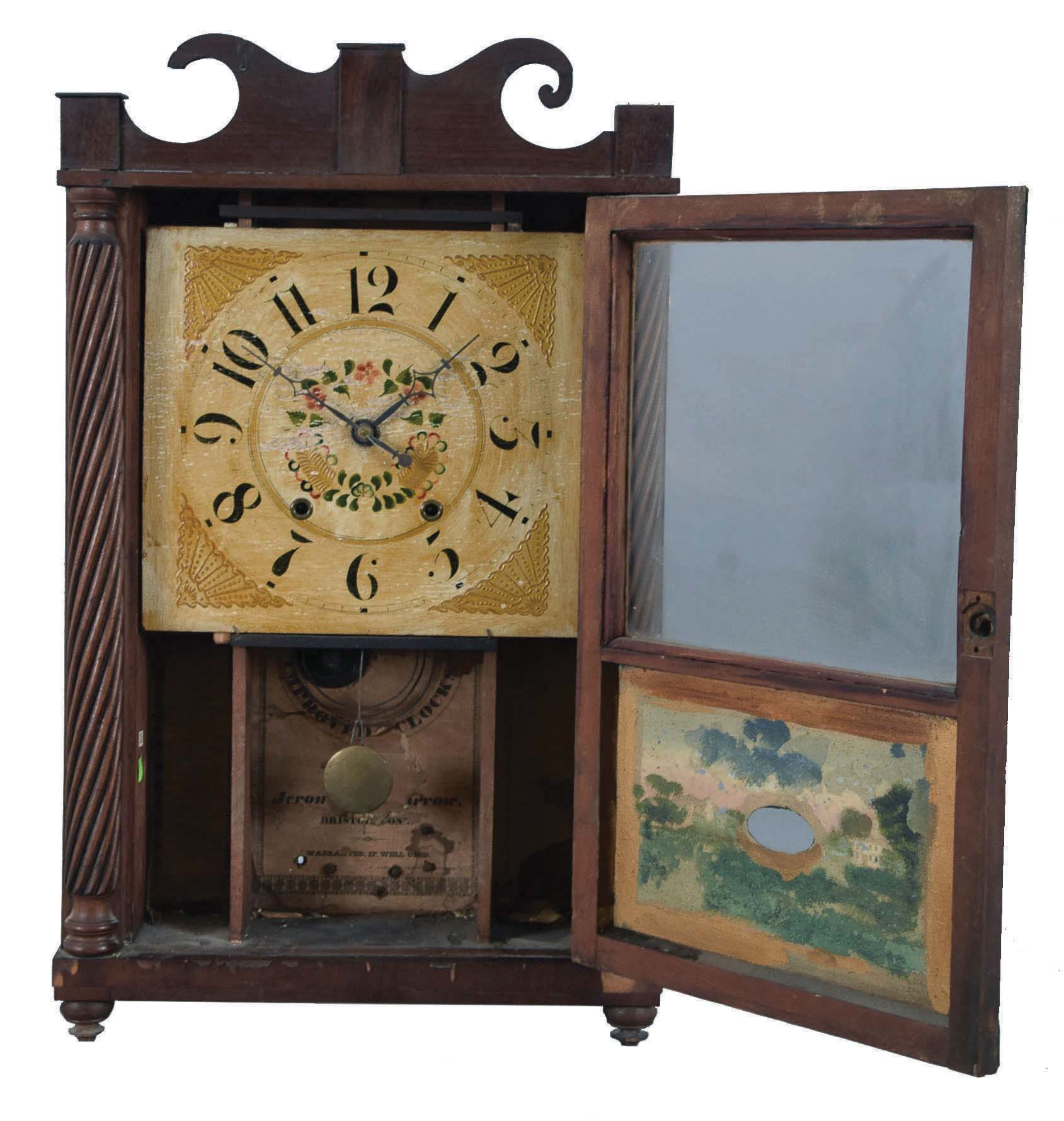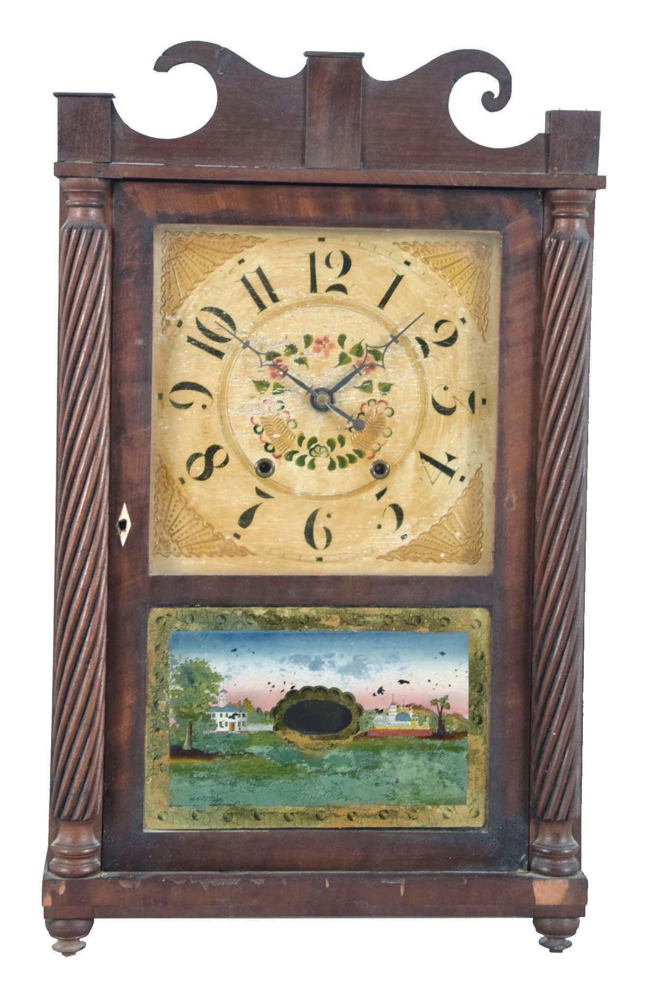 Condition Report: Mahogany and mahogany veneered case in an old finish has some veneer loss on the base, a broken tip on the left scroll of the jester splat and a poor repair to the right scroll. Period painted dial has turned yellow from a later application of shellac or varnish. This painted dial is probably a period replacement as the period hands are for a dial with the chapter ring inside the chapter. Someone has gouged out an area on the movement front to allow the pendulum to swing. The clock now has a gong rather than a bell. Original painted tablet has scattered loss and some inpainting. Two repro pineapple finials. Clean label inside. Original twist columns and feet. This is a scarce Jerome model worthy of restoration.