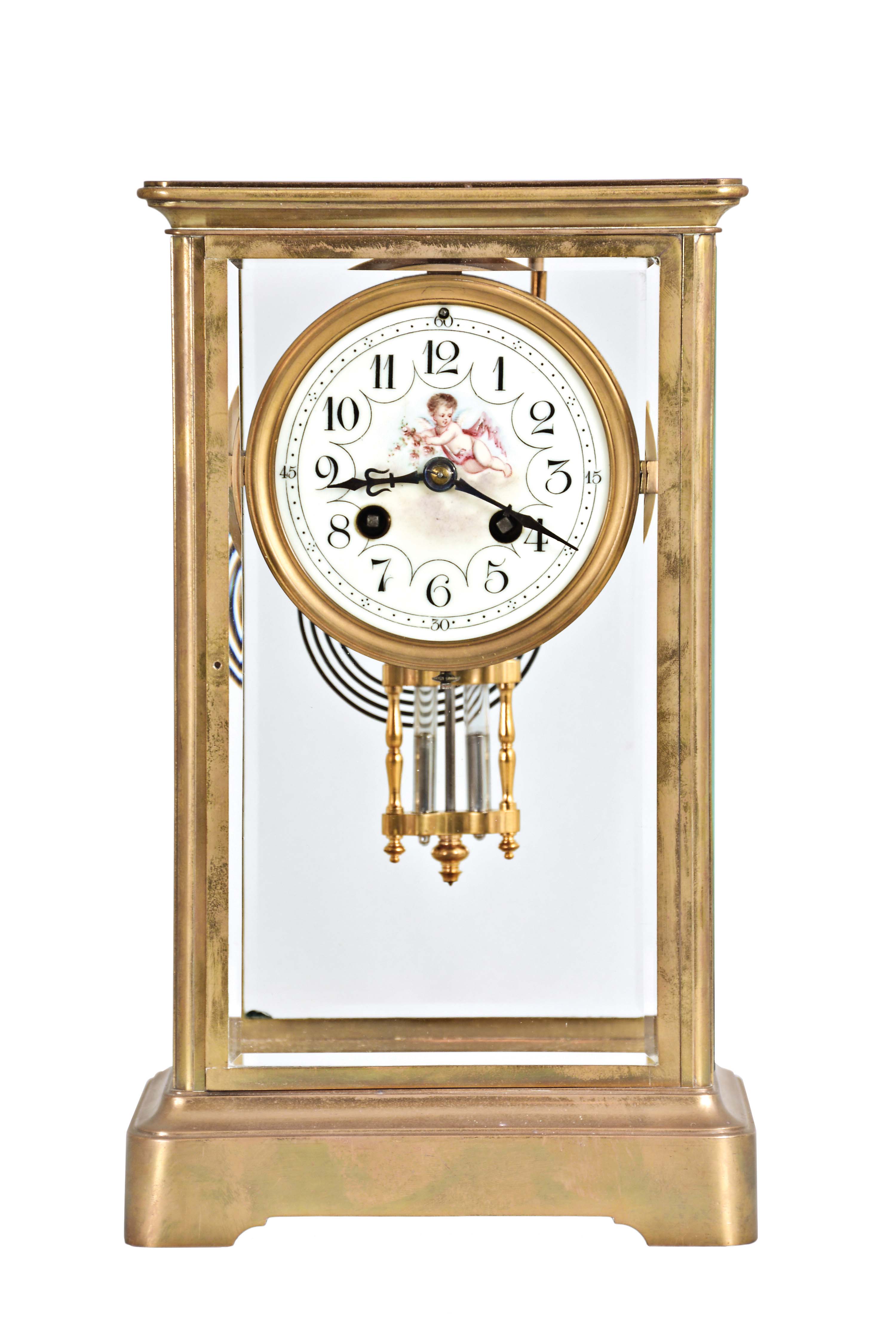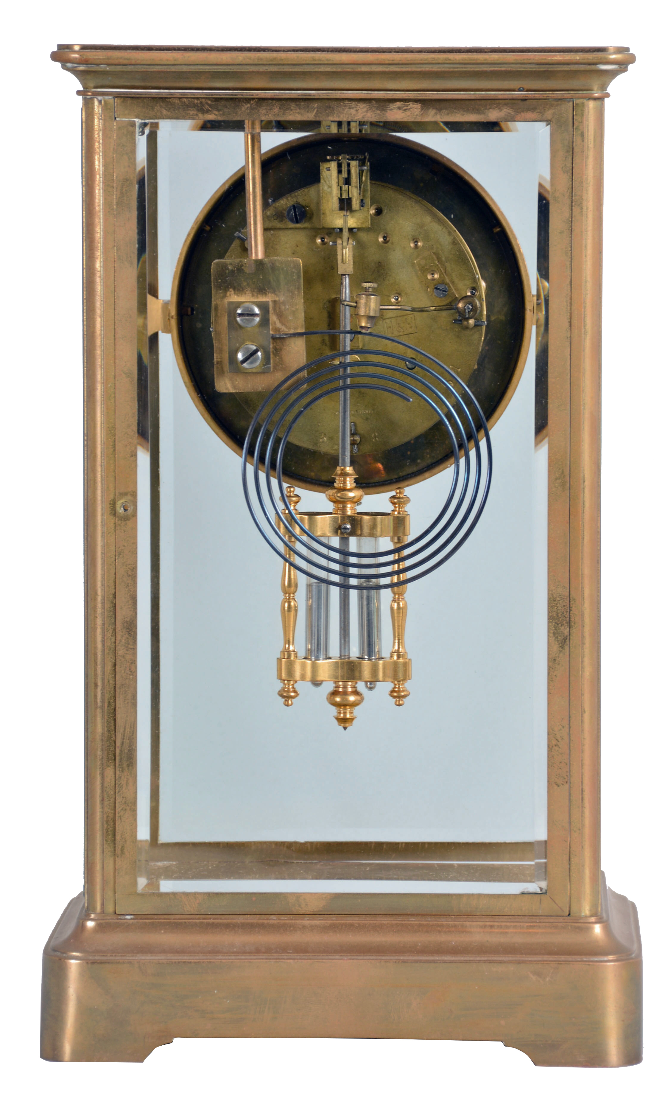 Condition Report: Brass case has some traces of original gilding. Original porcelain dial and all four beveled glass panels are fine. The front and rear door knobs are missing. Original pendulum.