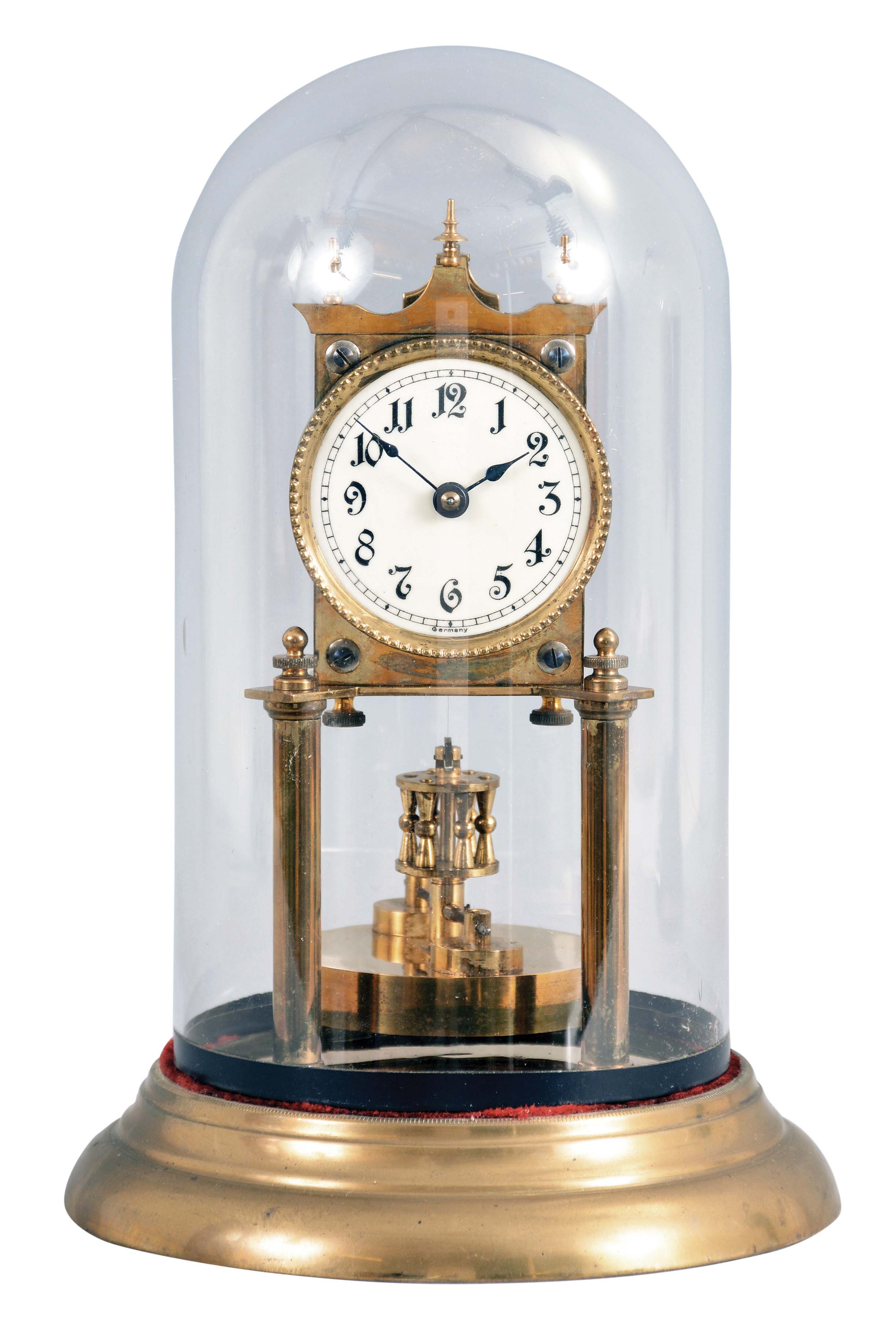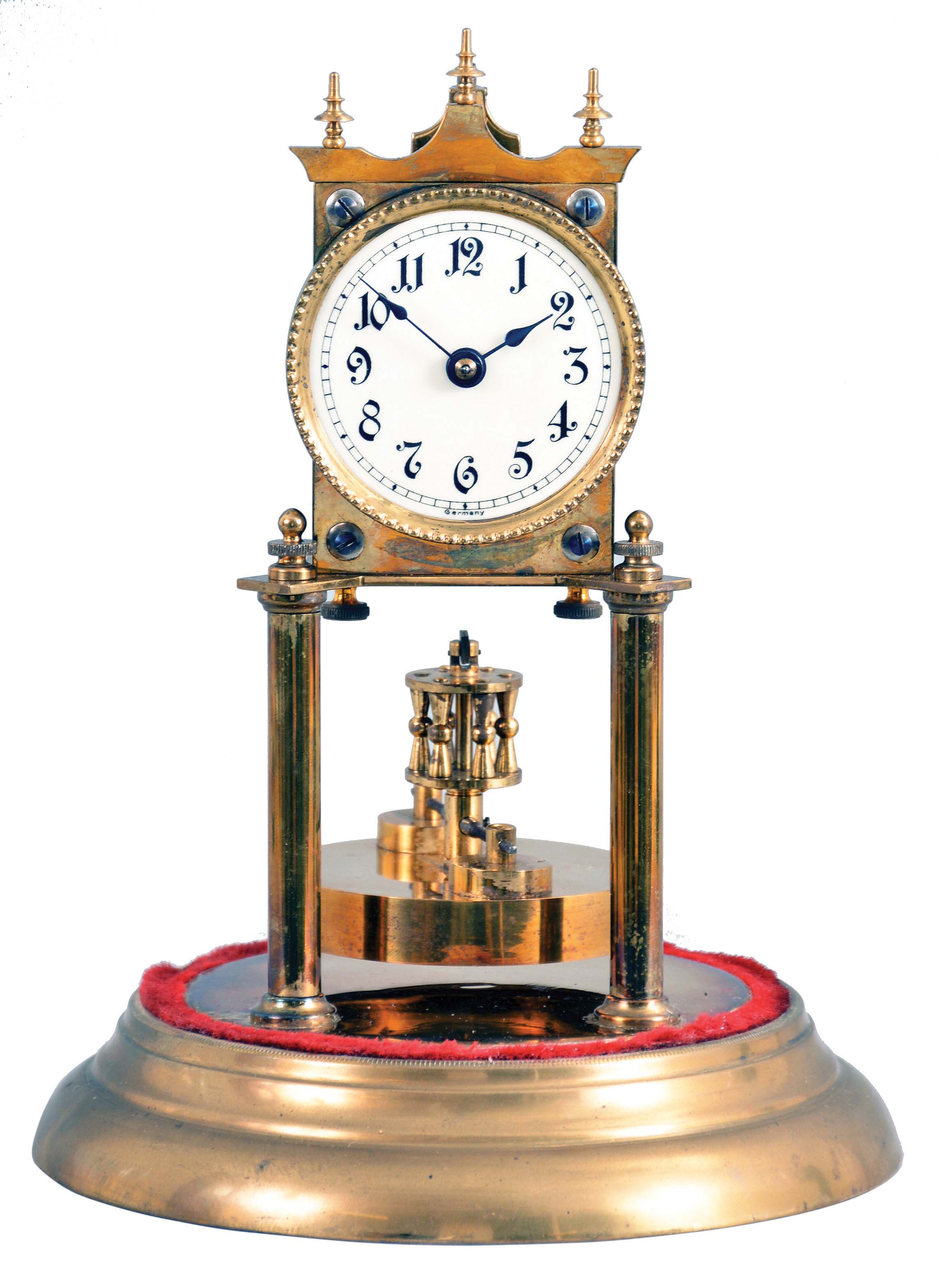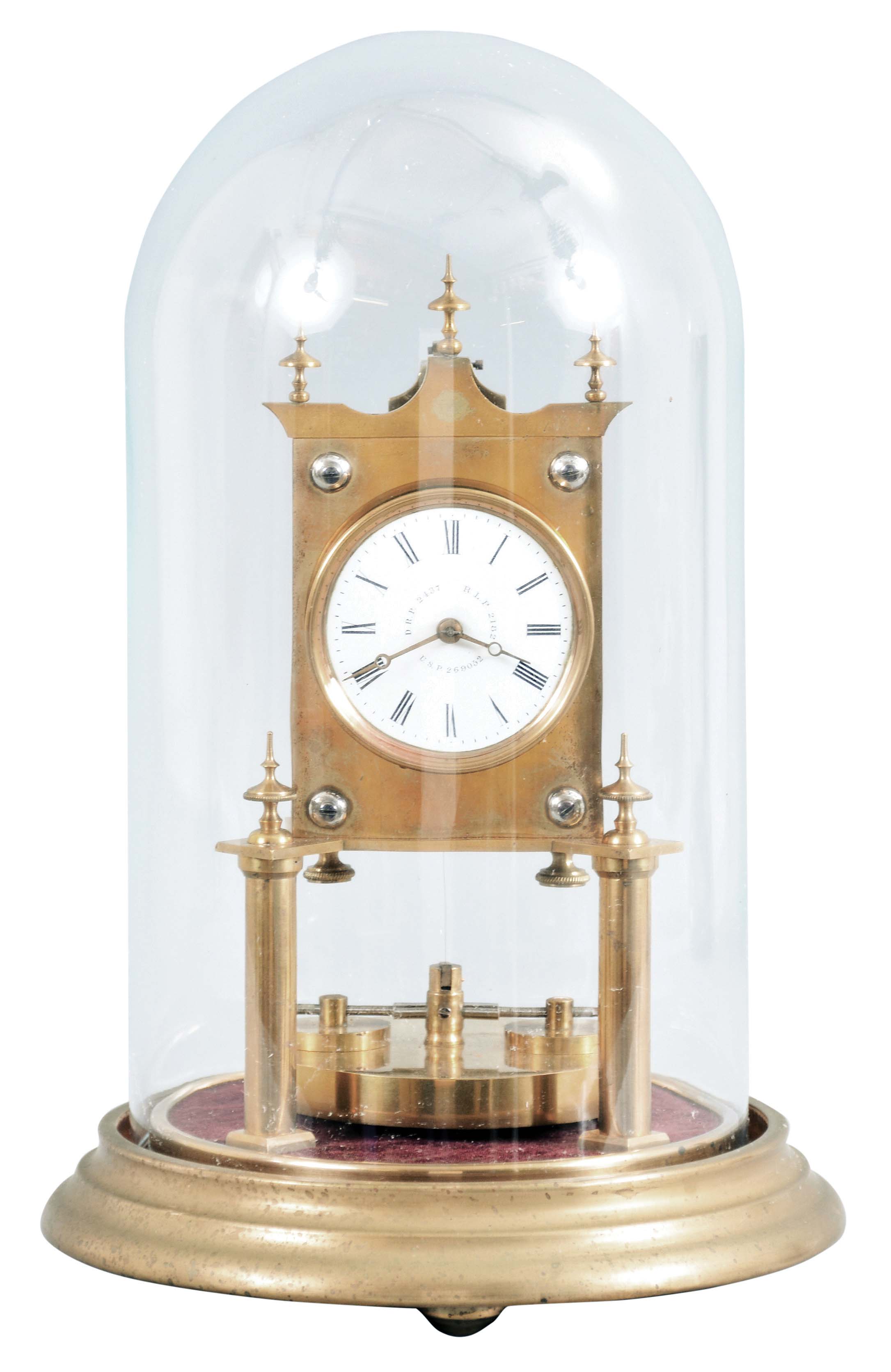 Germany, 400 day or anniversary clock, spring driven, torsion pendulum movement with disc pendulum in a polished brass case with cream porcelain dial under glass dome.