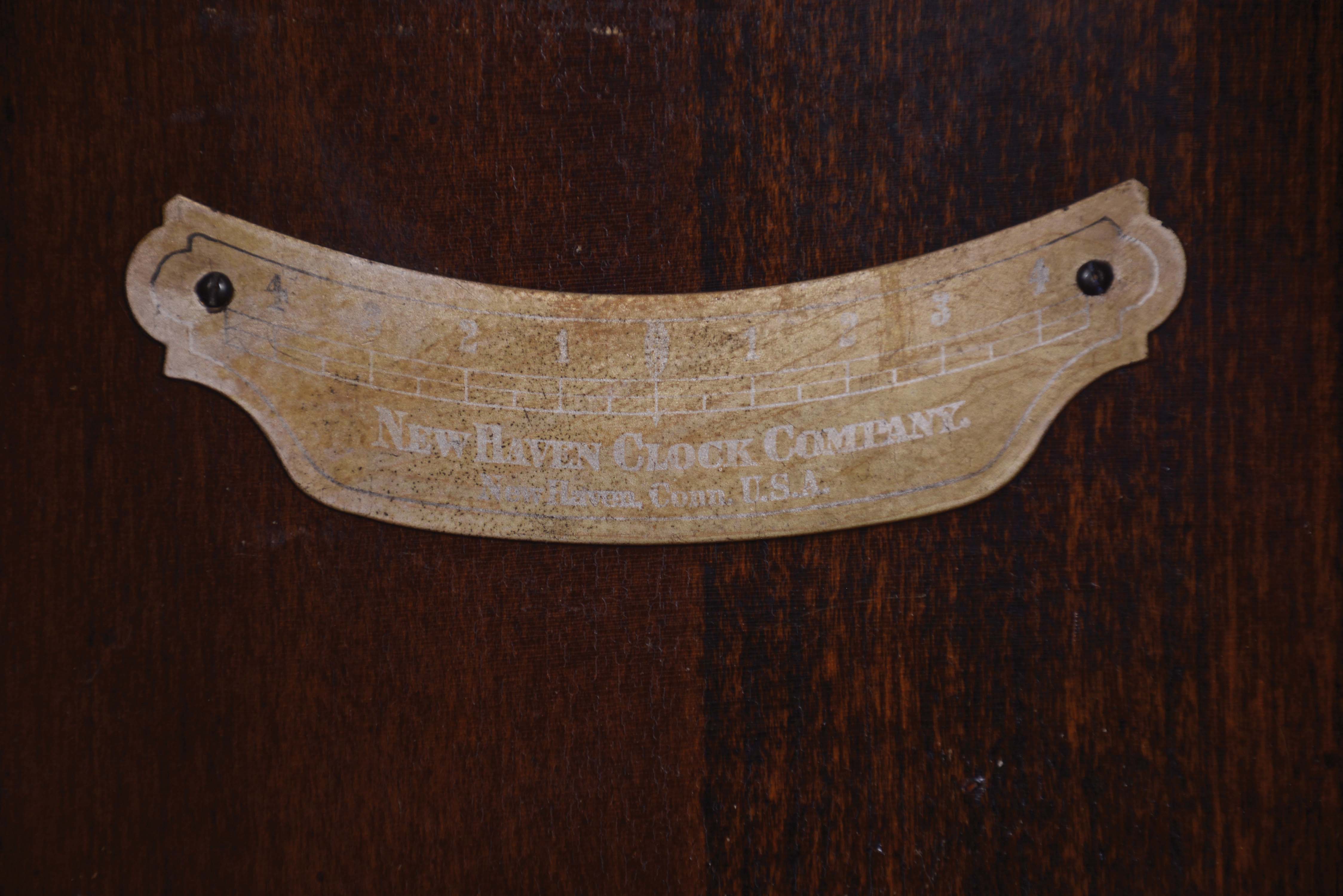 Condition Report: Mahogany case in original finish has small surface scratches and a couple dings. Original silvered dial in very nice condition. Original hands. Original pendulum has a small ding on one side. Beveled glass panels are fine.