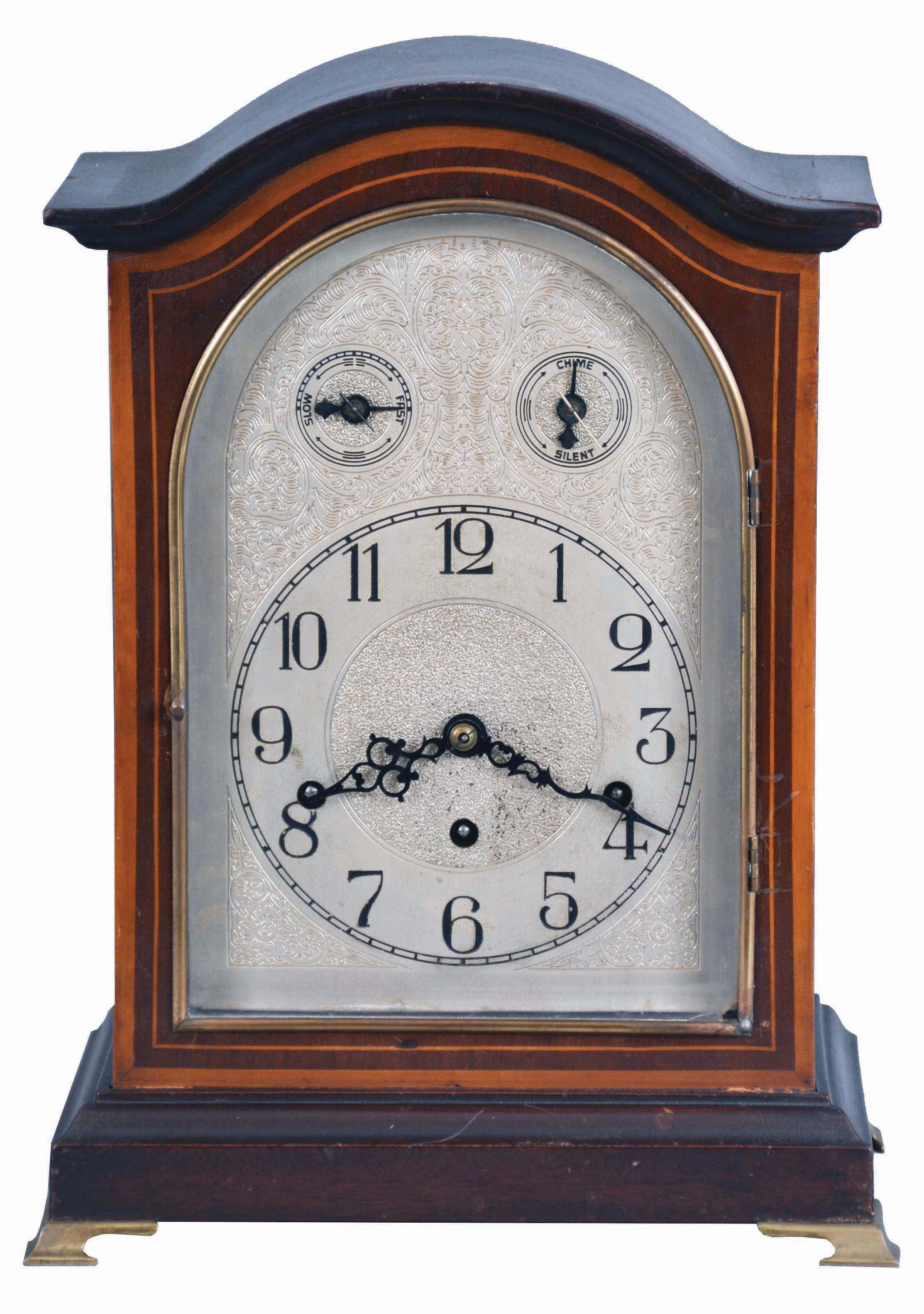 Condition Report: minute hand is off, trapped under the dial glass. One piece of string inlay is absent an the other will need to be secured. Glass has large crack. Feet are attached with modern screws. Movement ticks briskly when wound, but was not tested long term.