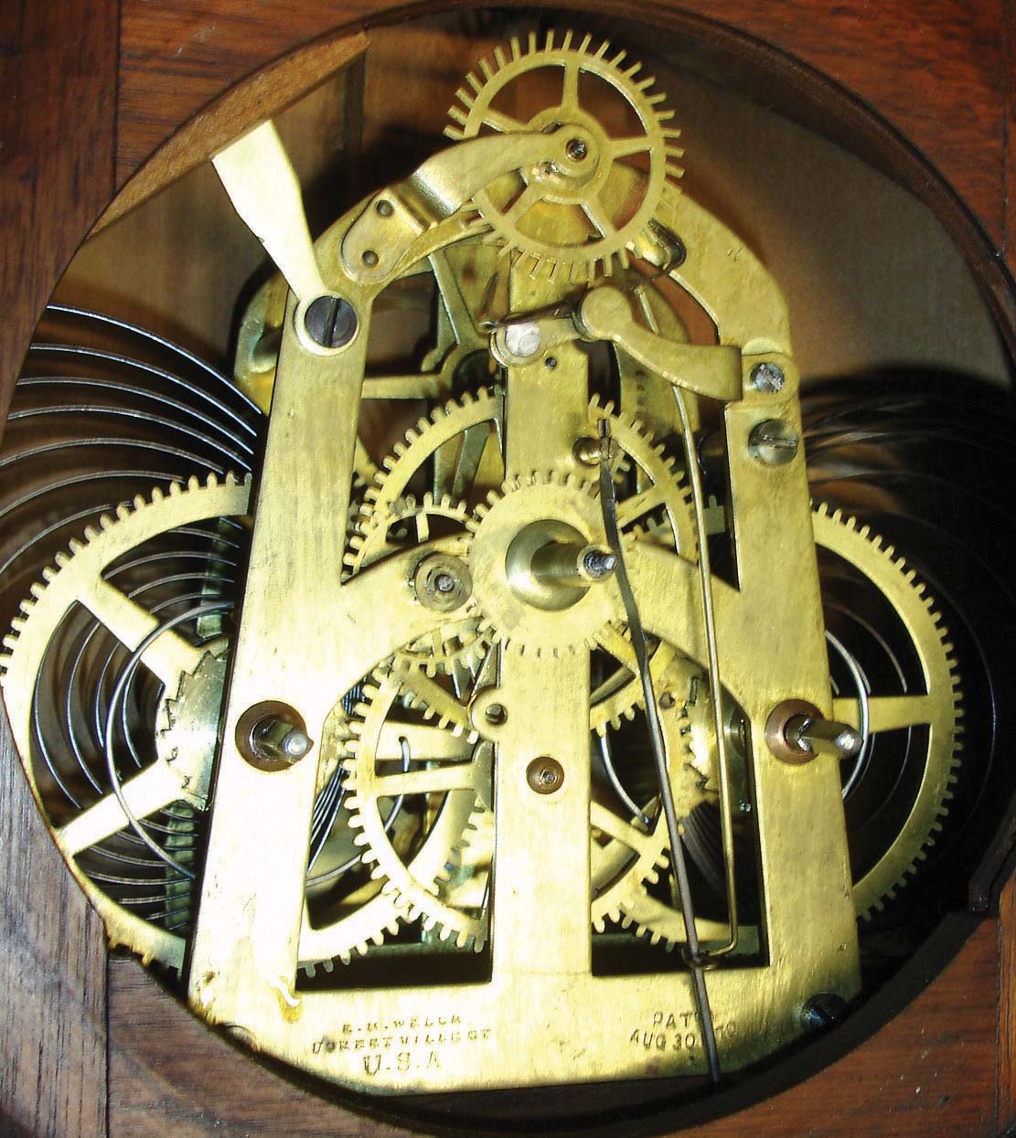 Prentiss Improvement Clock Co., calendar clock case and long duration movement only, no pendulum