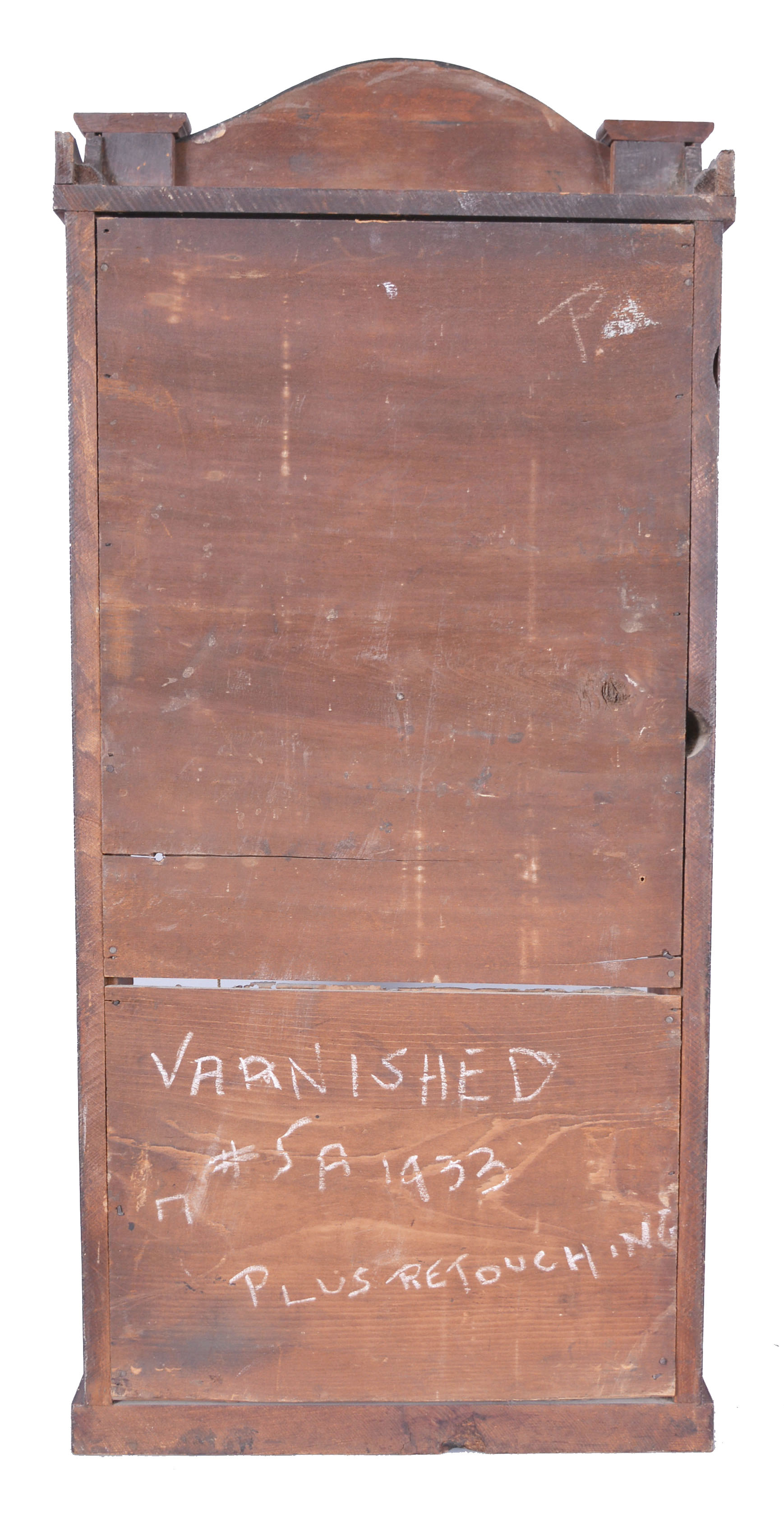 Condition Report: the case retains its original finish. The upper right return molding needs to be reglued and the crest has been repaired. There are several small splits in the door in the perimeter around the dial. There is a dent in the bezel hidden by the door near 7.