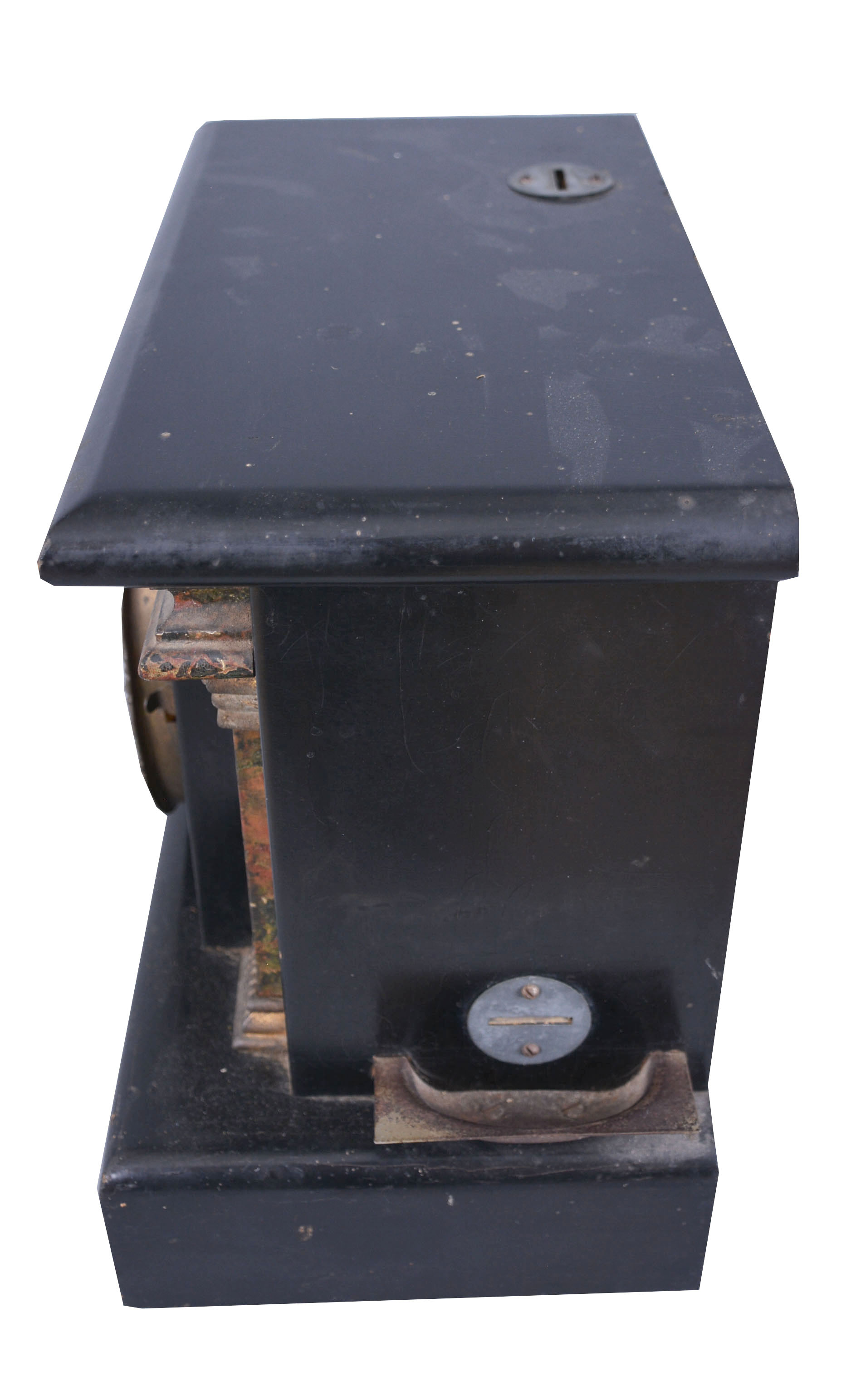 Condition Report: balance wheel train of the movement will need attention. The token dispenser works well and comes with two tokens of the right type. Paper dial is stained. Black enamel case has small scratches and losses. Original sign that was mounted to the top is absent. Brass coin tray is inside the clock.